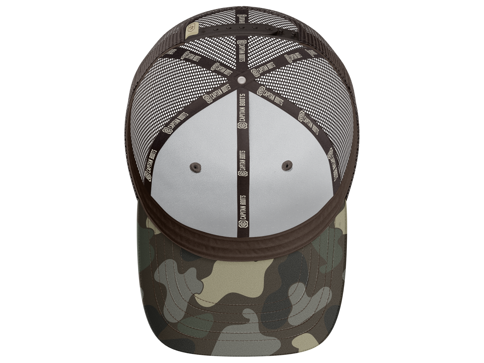 Capitan Boots 3D embroidered logo on a canyon camo and brown mesh back trucker hat. Shade your eyes and look good doing it.