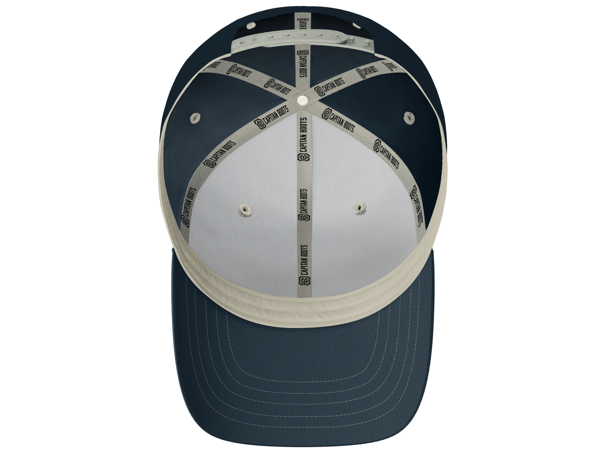 Capitan Boots logo patch on a dark teal cap. No fuss. No Frill.