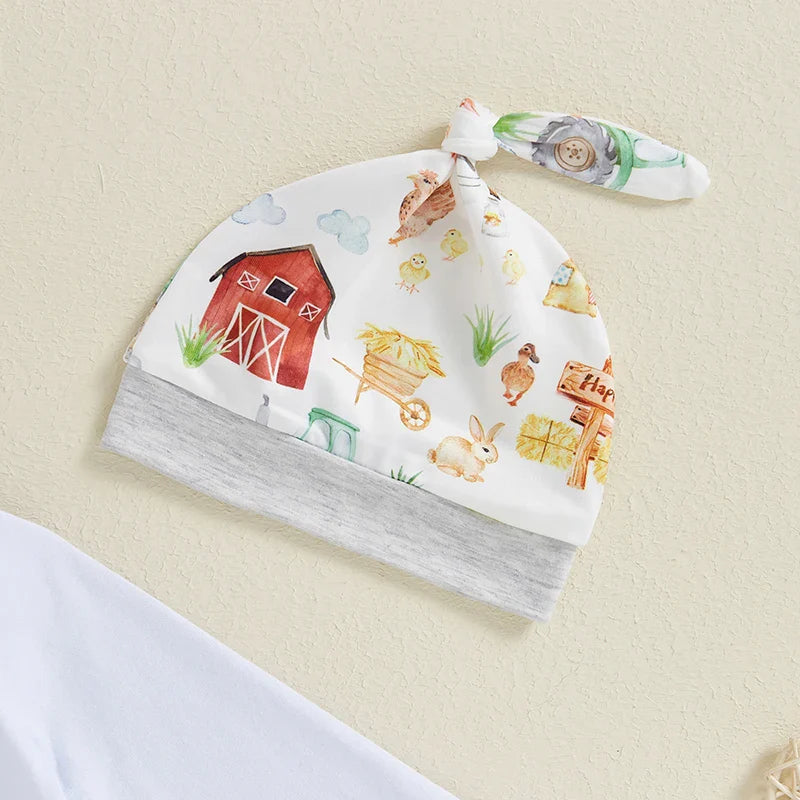 Baby Boys Girls 3Pcs New To The Farm Long Sleeve Crew Neck Letter Barn Print Romper with Animal Print Long Pants and Hat Set
