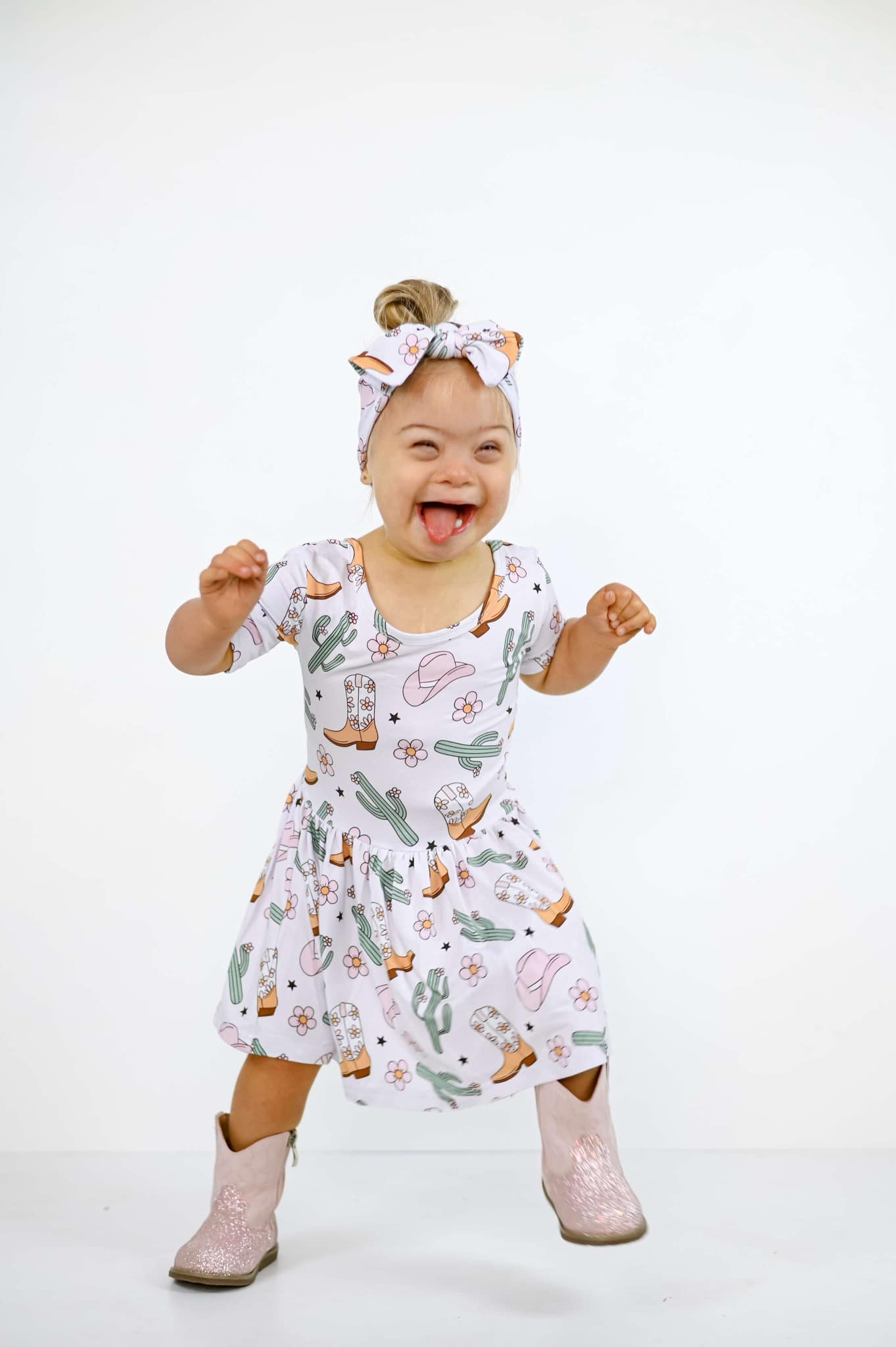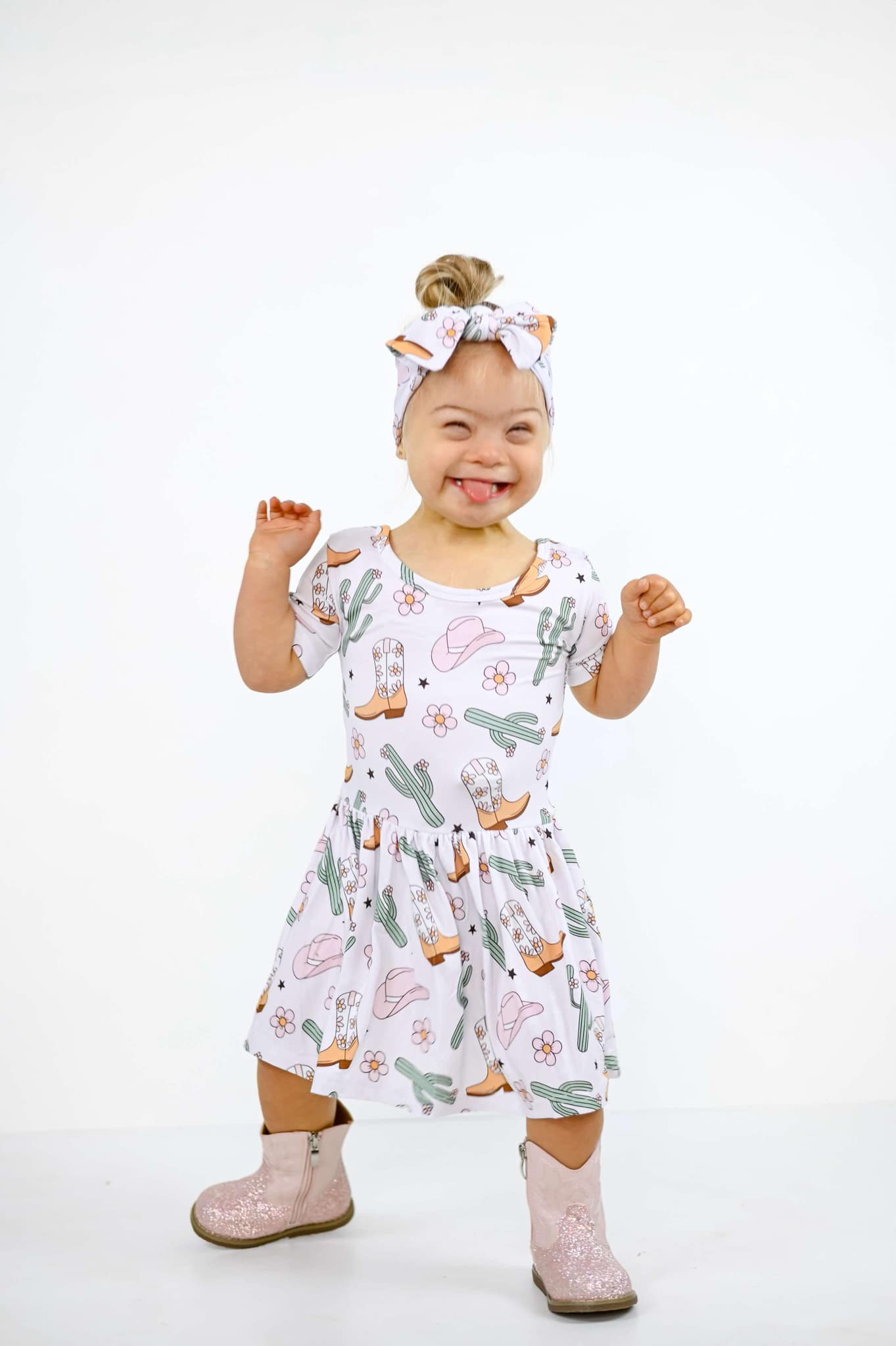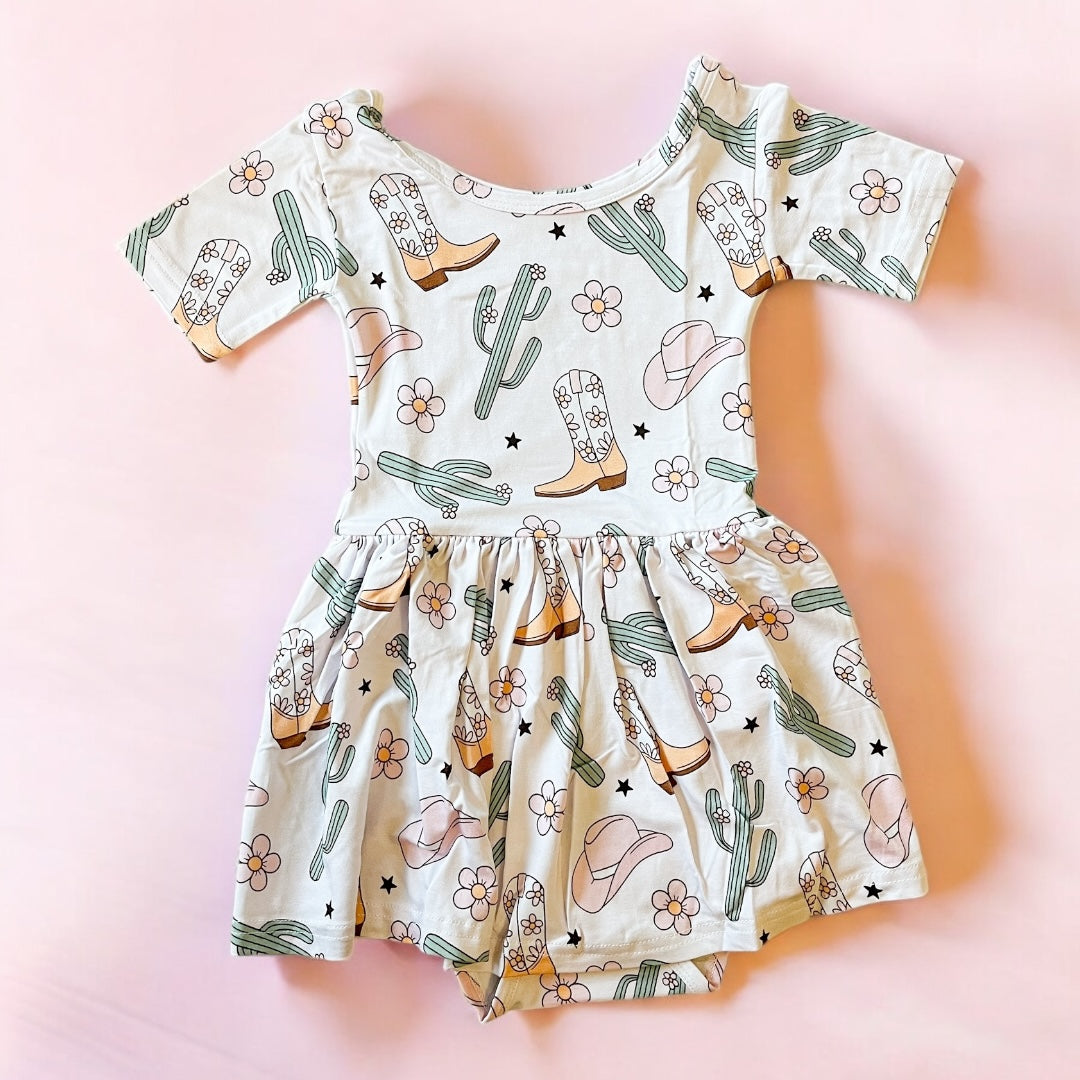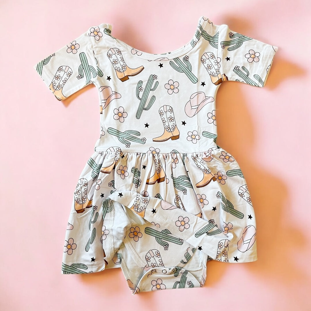 Your little cowgirl will be the cutest on the range in this ultra-soft bamboo bodysuit dress! Featuring a sweet western print with cowboy boots, cacti, flowers, and hats, this dress is perfect for photoshoots, rodeo days, or just adding a little yeehaw to everyday play.