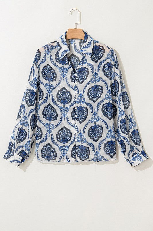 Blue Tribal Pattern Buttoned Front Loose Shirt