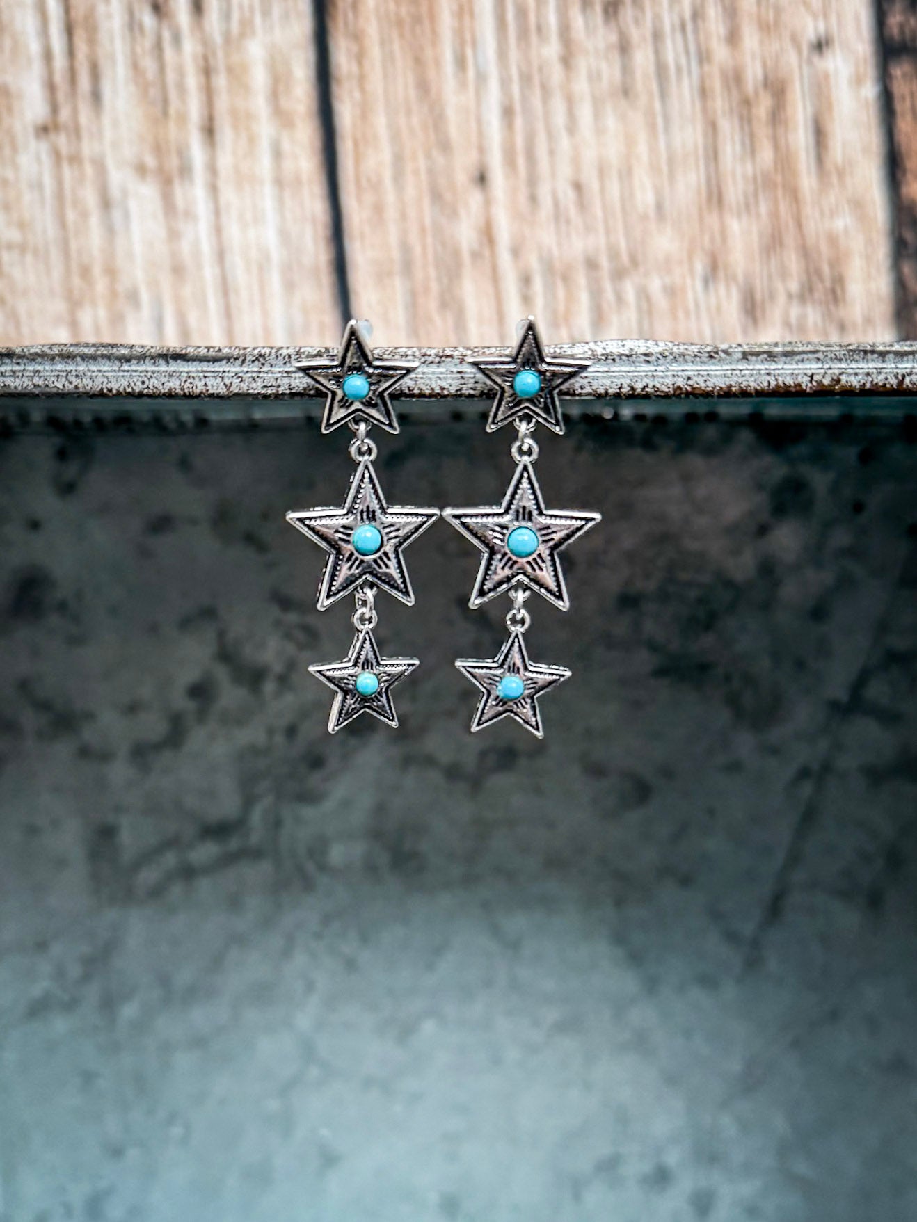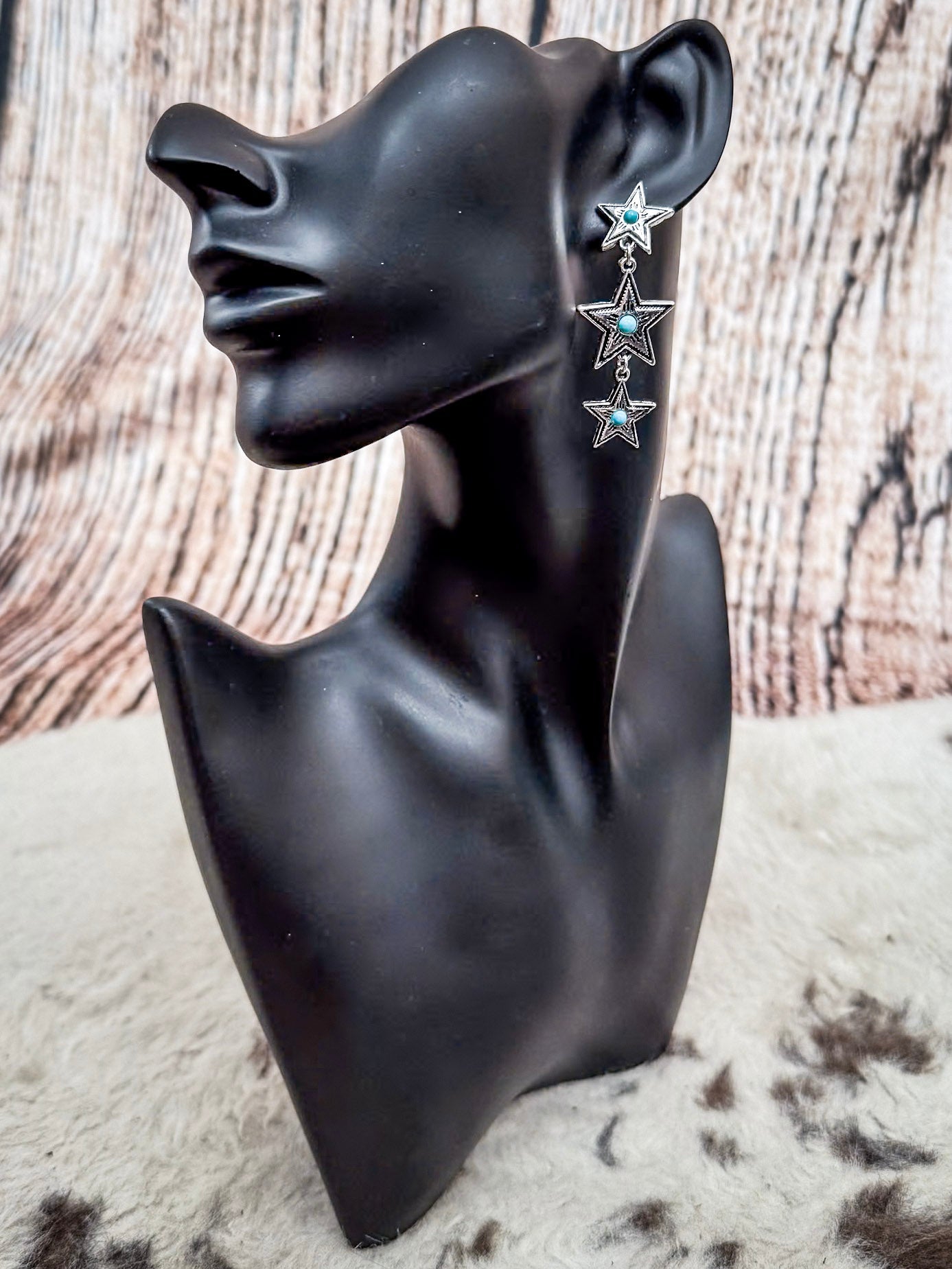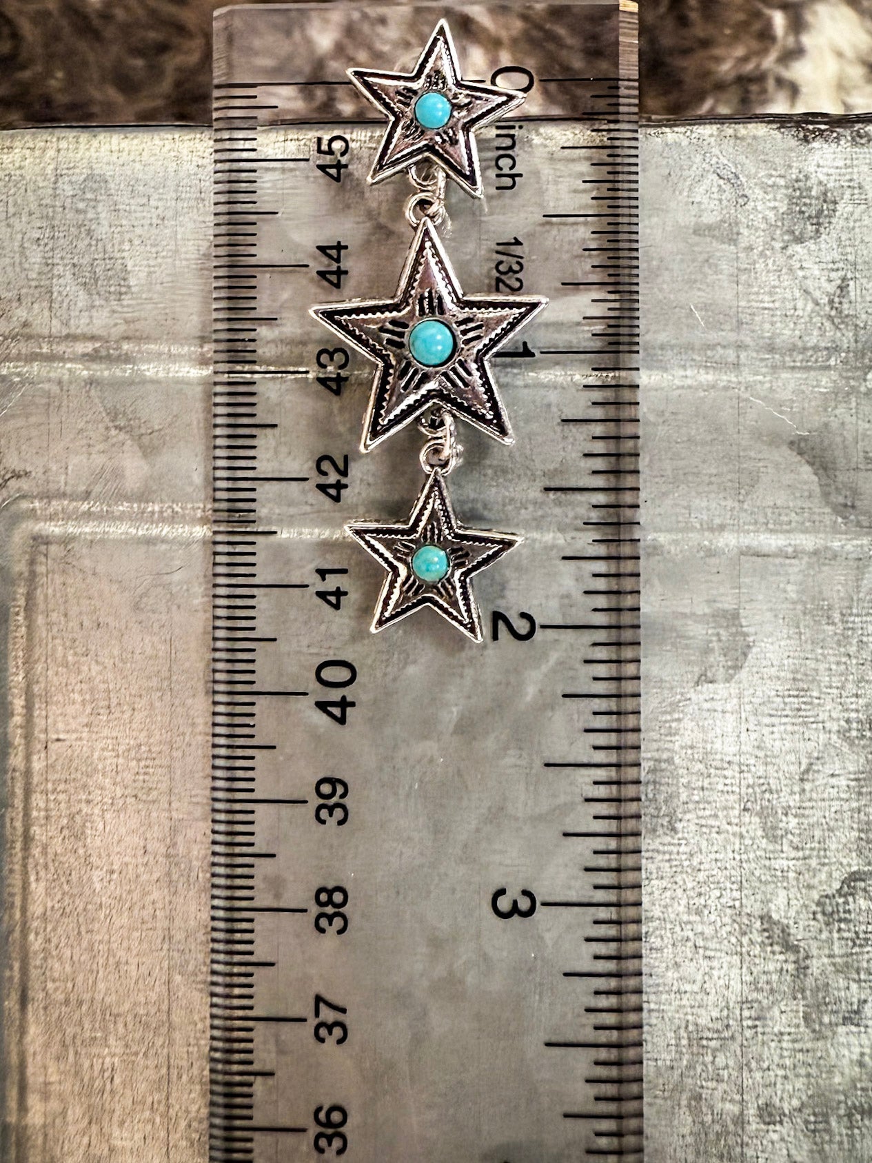 These triple-star beauties are bold but easy, eye-catching but effortless. They’re designed with three cascading silver stars, each etched with intricate burst detailing that gives ‘em that vintage, tooled-leather kinda feel. At the heart of every star? A bright pop of turquoise that brings the whole look to life. It's the perfect touch of color—vivid, grounded, and timeless.