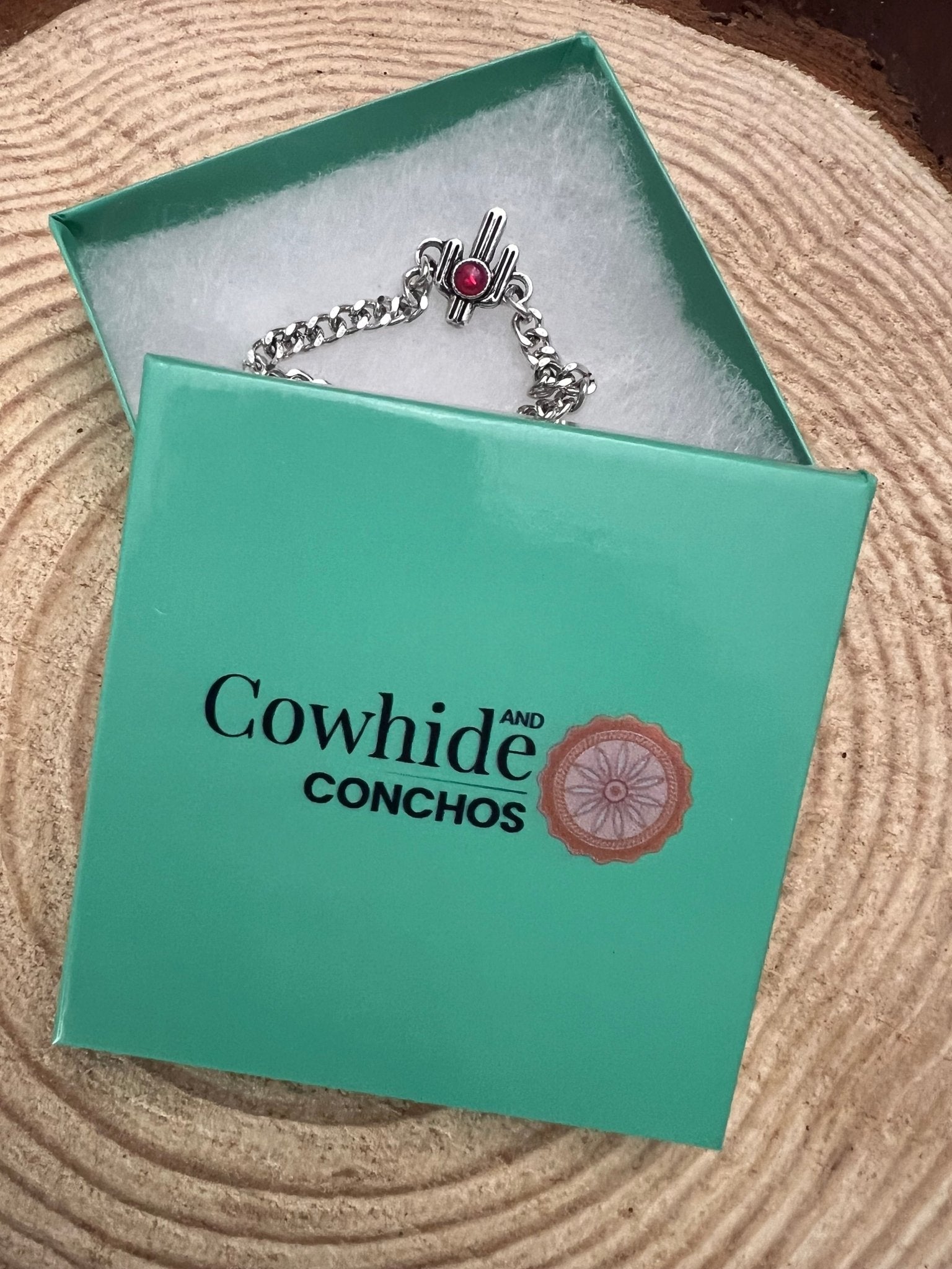Add a touch of bohemian charm to your wardrobe with our Cactus and Pink Stone Cuban Chain Bracelet. Elevate your style with this unique piece that will add a pop of color to any outfit.