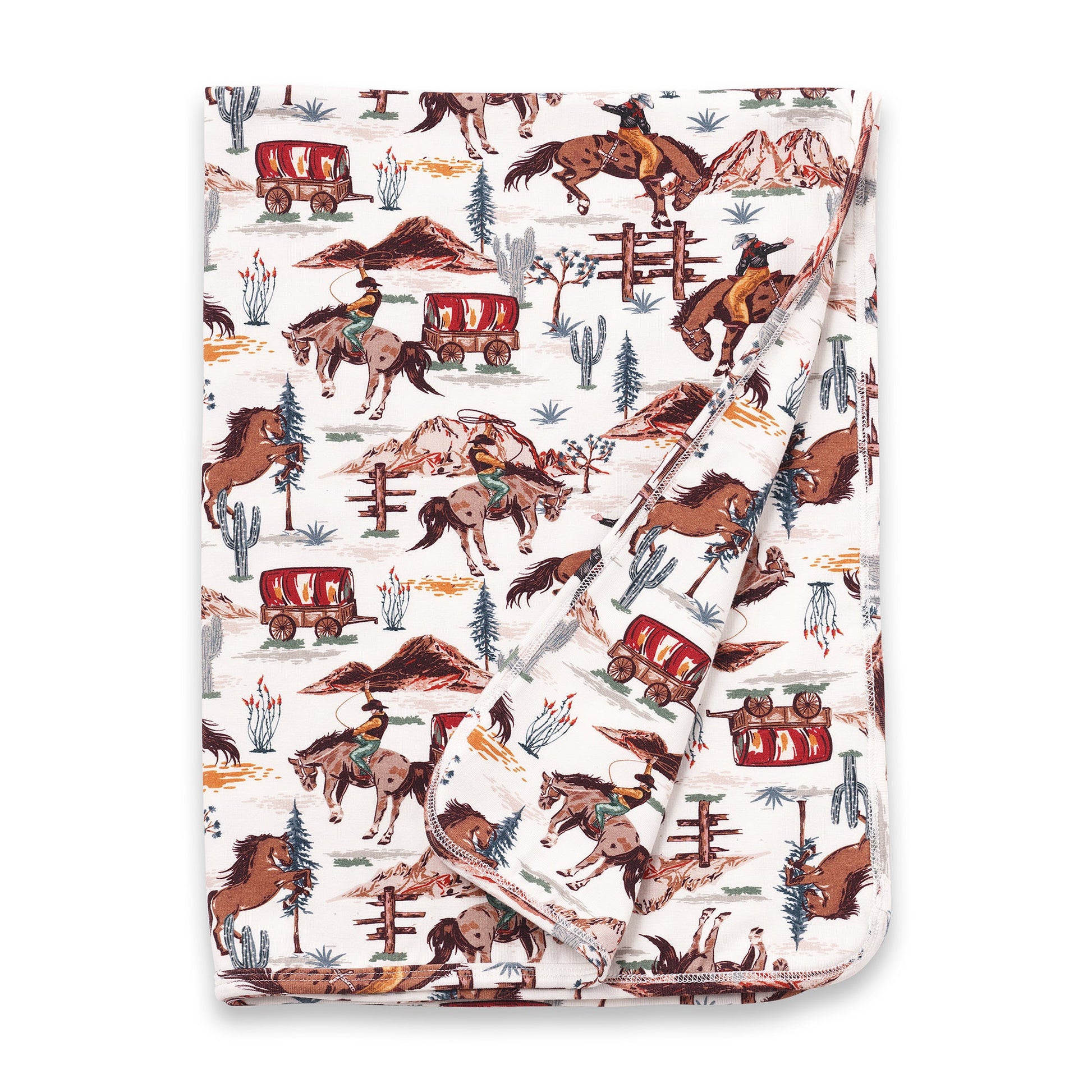 Giddy up for comfort! This ultra-soft stroller blanket corrals coziness with a playful Wild West print of horses, riders, and wagons. Crafted from a breathable bamboo/cotton/spandex blend, it’s eco-friendly, hypoallergenic, and just the right size at 30" x 22"—perfect for pint-sized pioneers on the go.