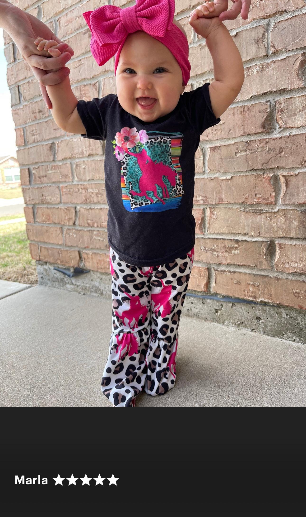 Let your little cowgirl shine in this Cowgirl Bell Bottom Outfit featuring Pink Bronc Rider silhouettes and bold animal print! Perfect for rodeo fans and little ones who love a touch of Western flair, this Girls Bell Bottom Set is both stylish and fun.
