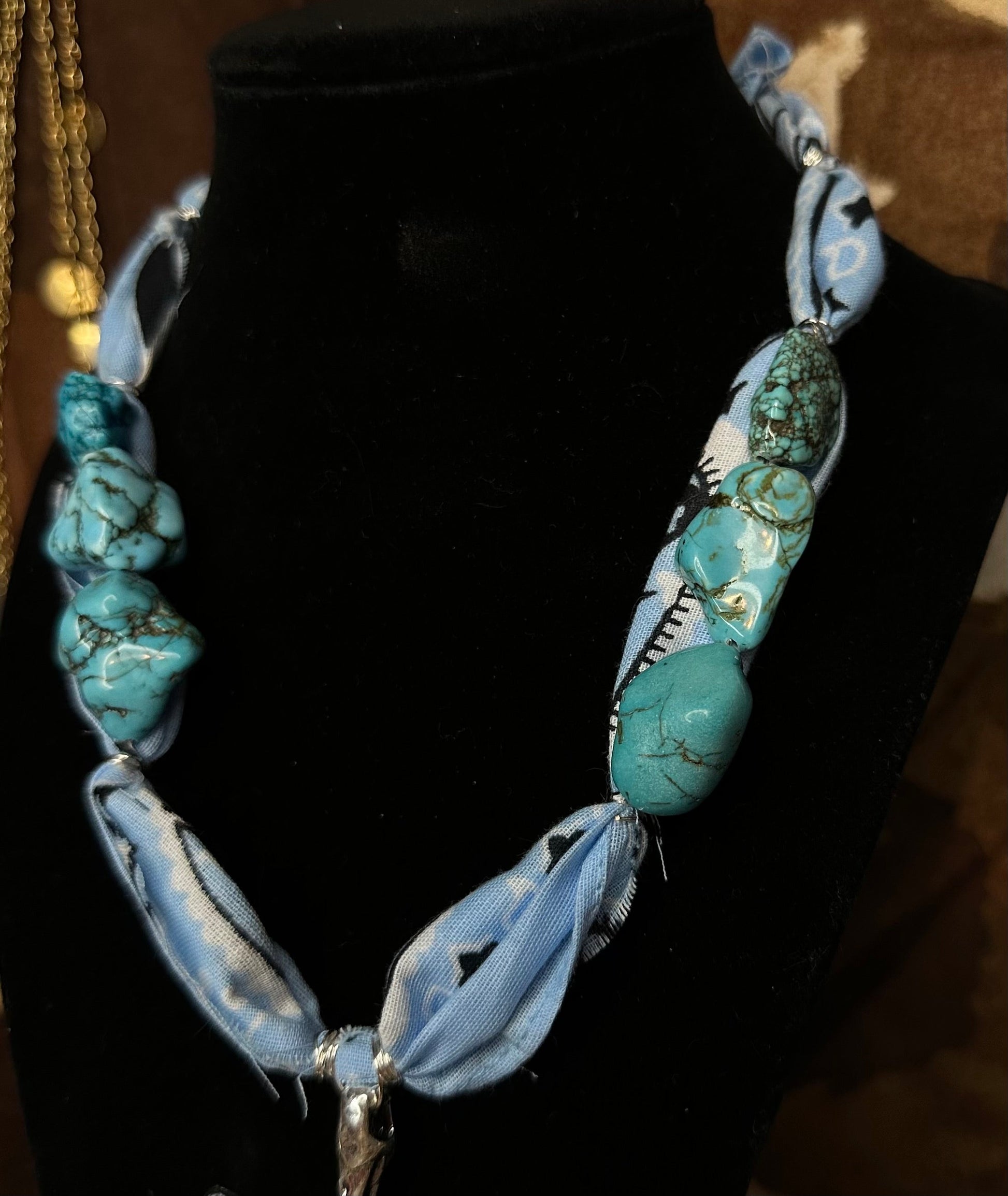 Channel true western spirit with this bold and soulful statement piece. The Dust and Devotion necklace features a soft blue bandana wrap, hand-tied with large turquoise stones and finished with a silver cross inlaid with genuine turquoise. Perfect for cowgirls with grit, grace, and a heart full of faith.
