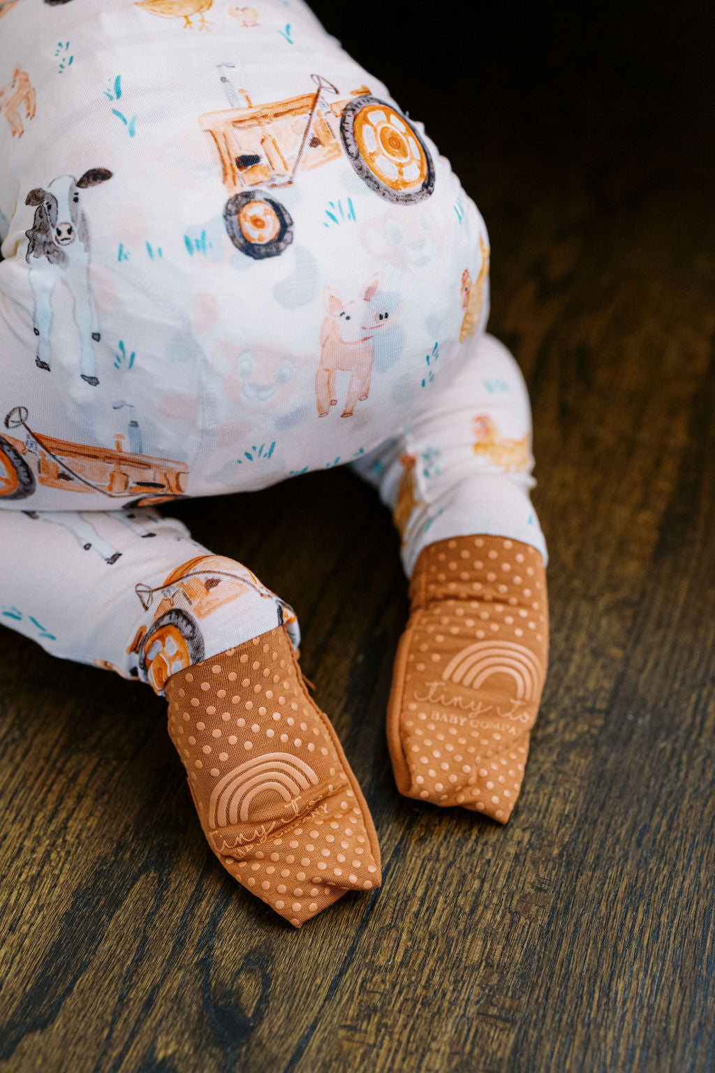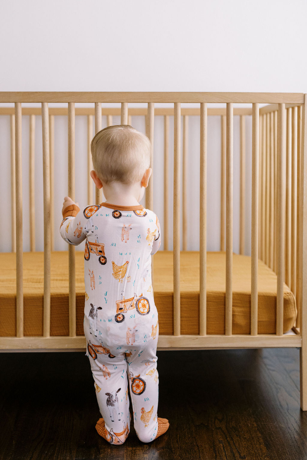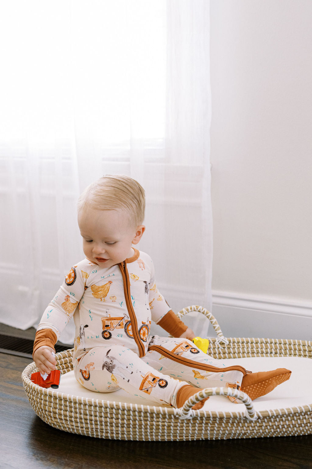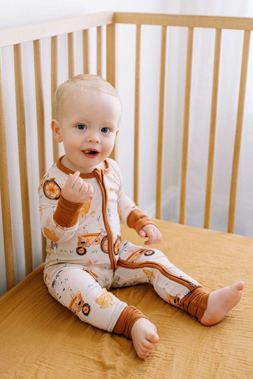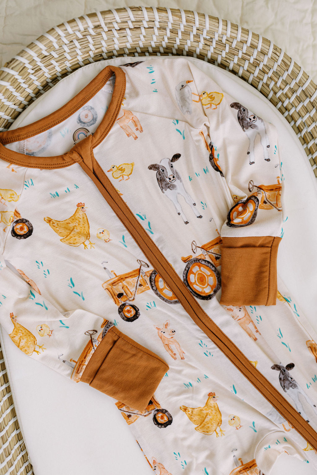 Wrap your little one in comfort and cuteness with our Farm Friends Bamboo Zipper Romper! Made from ultra-soft, breathable bamboo fabric, this adorable romper features an all-over farm animal print—perfect for little animal lovers.