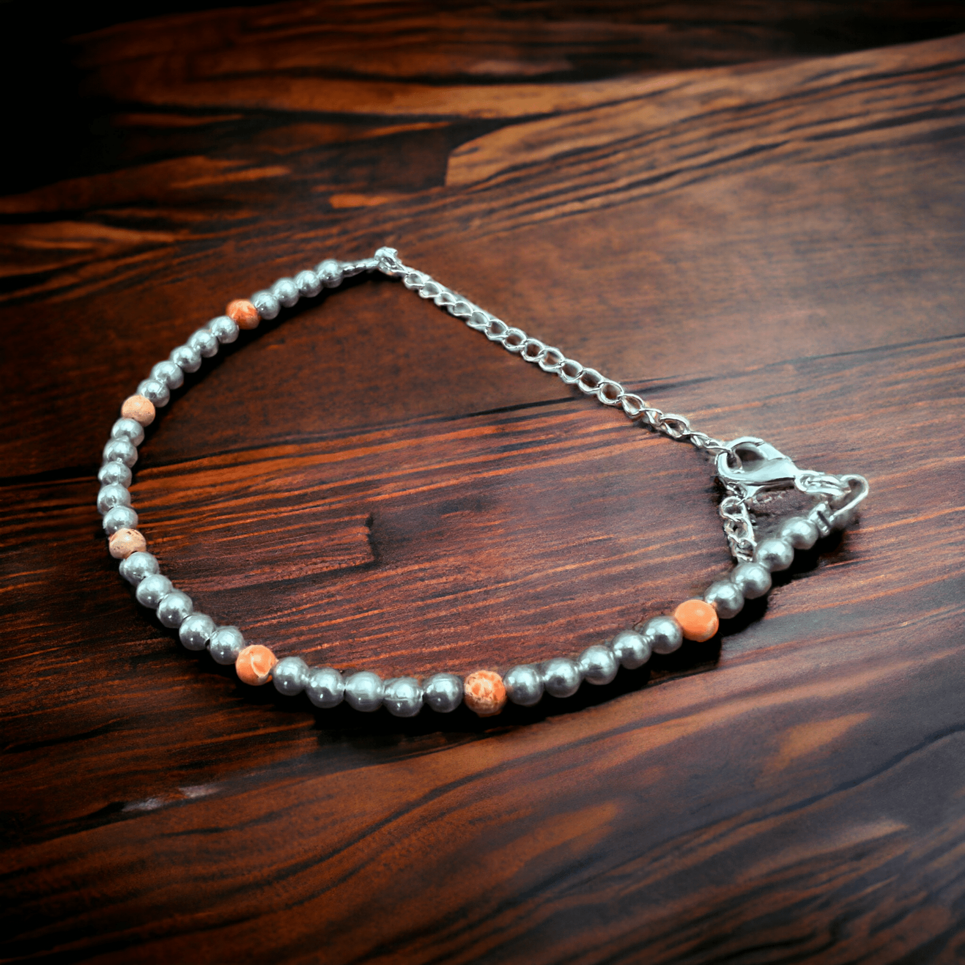 This stunning Sterling Pearl Bracelet features a touch of vibrant orange with 6 inch beads, a 3 inch chain, silver plating, and 4 mm magnesite orange beads. Perfect for adding a pop of color to any outfit!