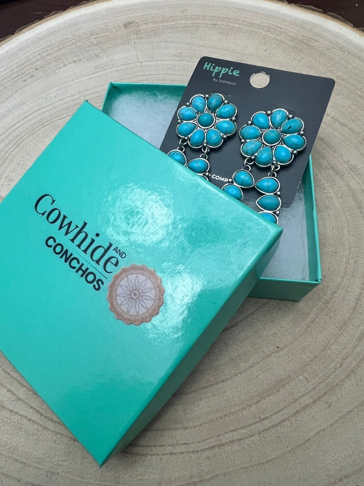 These Faux Turquoise Cluster Post Earrings make a bold statement with their impressive 2 1/4 inch size. Featuring a striking cluster of vibrant faux turquoise stones, they capture the spirit of Western style with a modern twist.