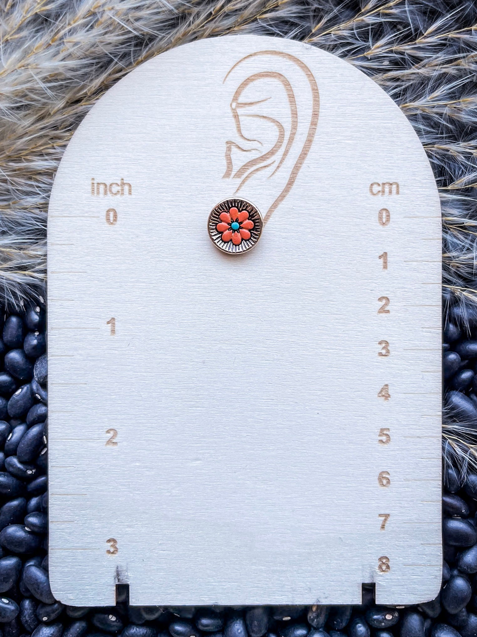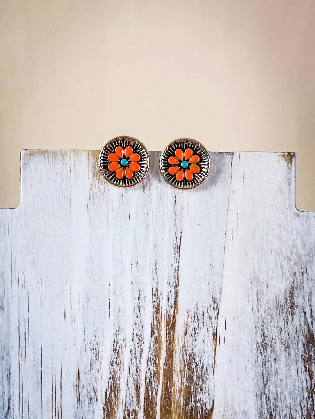 Designed with intricate detailing, the delicate floral motif reflects the essence of open prairies and breathtaking western landscapes. The finely crafted metalwork blends vintage inspiration with a modern touch, creating a unique balance between rustic appeal and refined elegance. The floral design adds a hint of femininity while maintaining a sturdy and versatile structure that will make these earrings a staple in your collection for years to come.