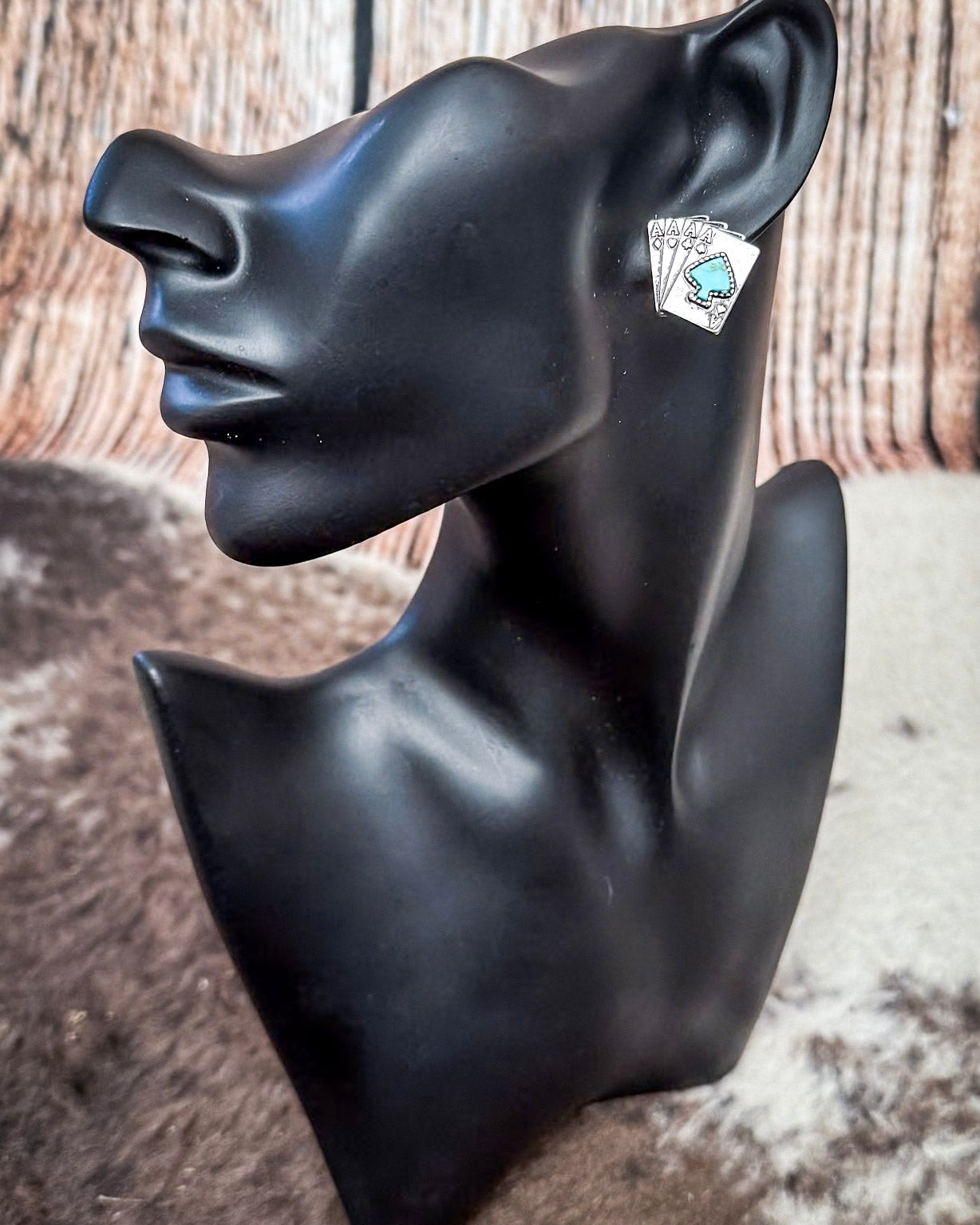 At the center of each earring, a striking turquoise colored spade takes the spotlight, bringing a vibrant pop of color and a nod to Southwestern artistry. The turquoise colored inlay is bordered with delicate beading, adding a rustic charm and hand-crafted quality that instantly elevates the design. It’s the perfect fusion of vintage card-room cool and rugged western soul, ideal for those who live life with a little edge and a lot of personality.