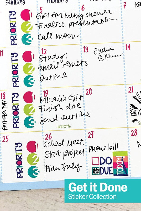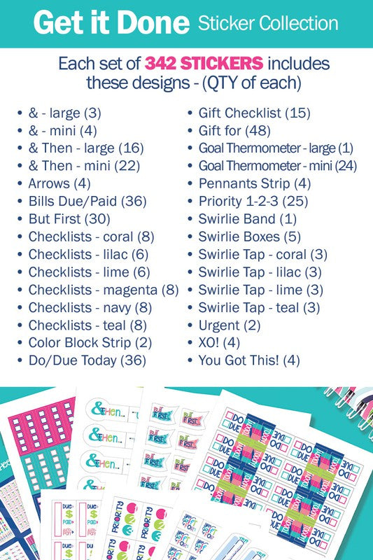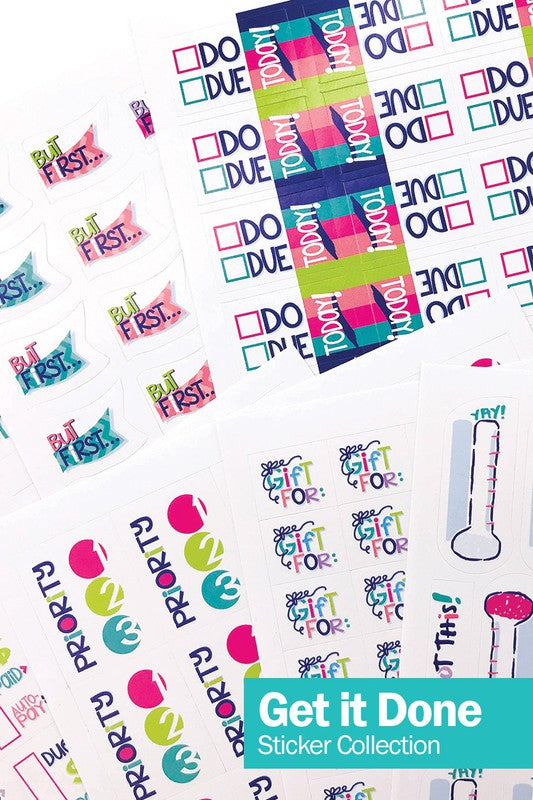 To be productive, you must first organize & prioritize. This set of 342 Get it Done stickers includes checklist strips, goal thermometers, priority 1-2-3, gifting to-do's, "but firsts" and "& thens" and more!