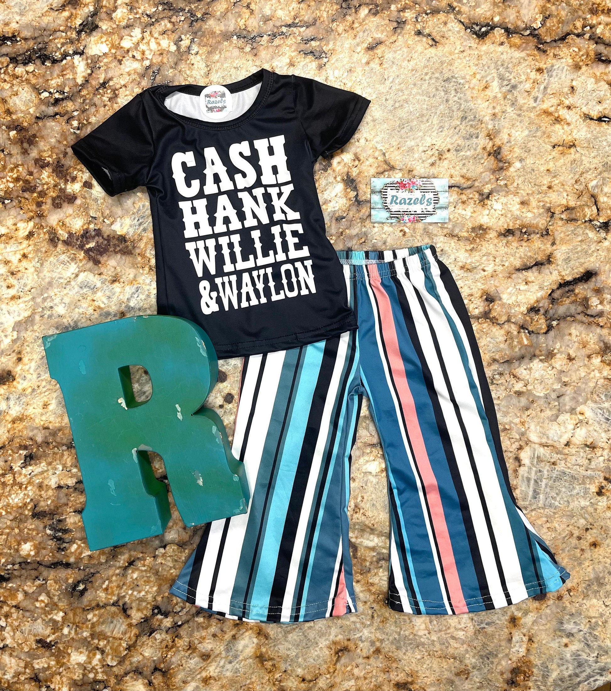 This super fun set features a black tee repping the greats: CASH, HANK, WILLIE & WAYLON—paired with bold, striped bell bottoms that are pure country sass 😍😍 Perfect for fairs, concerts, or just showing off their classic taste in music! 🎸🎶