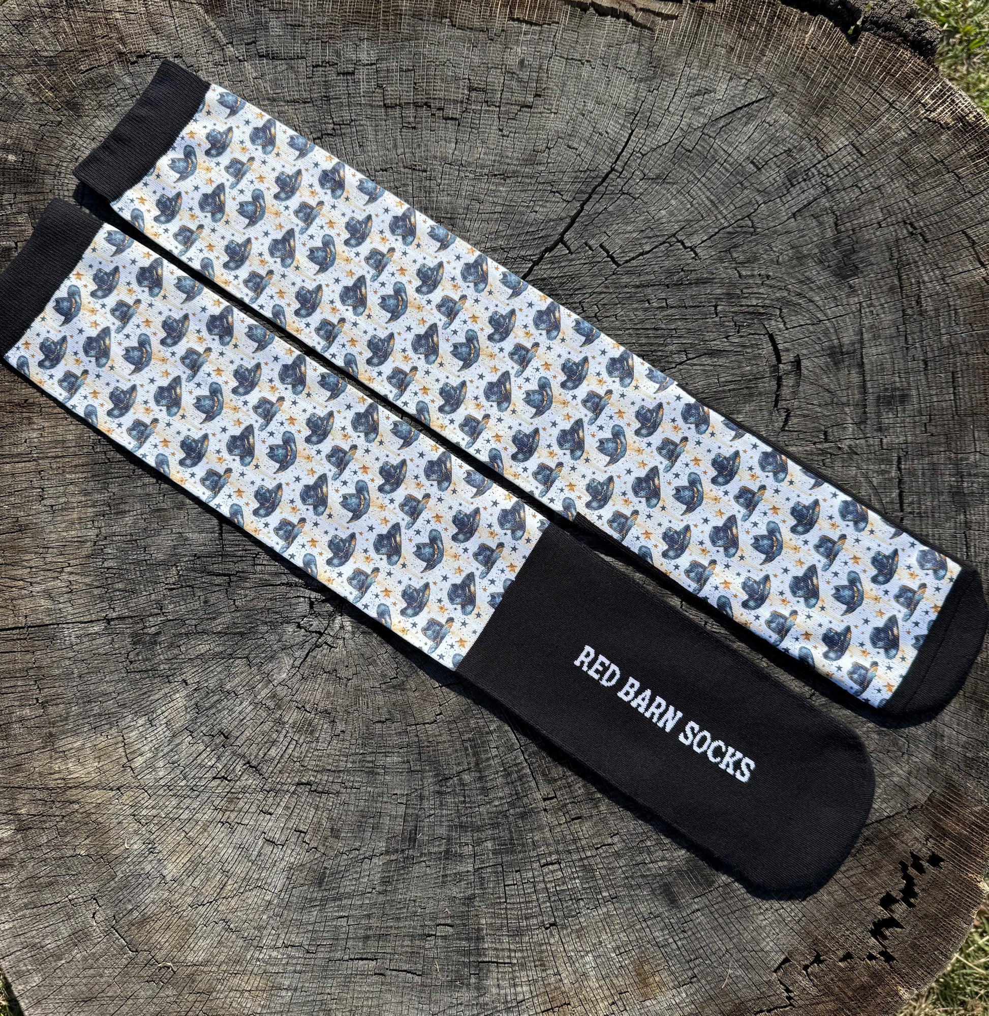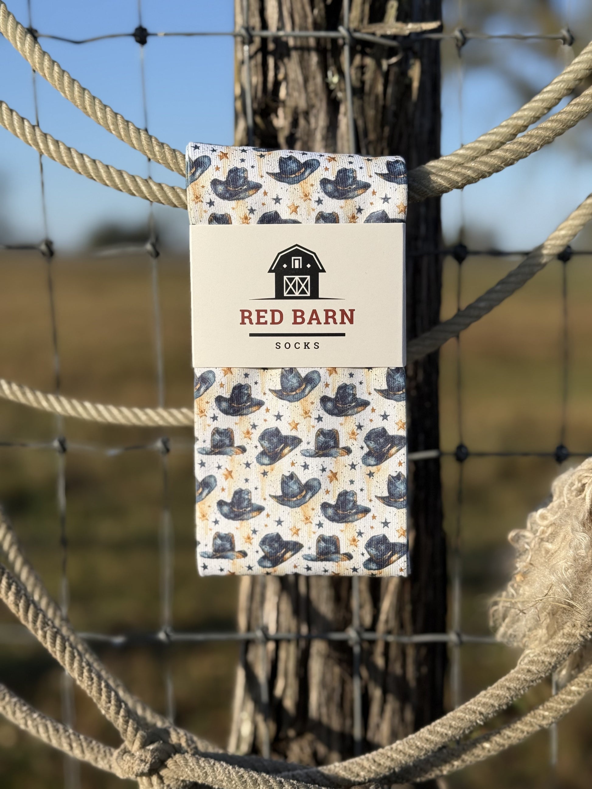 Step up your style game with Red Barn Socks - Golden Cowboy. Made with quality materials to provide ultimate comfort for long days on your feet, these socks combine durability with bold western charm. Add a touch of gold to your stride!