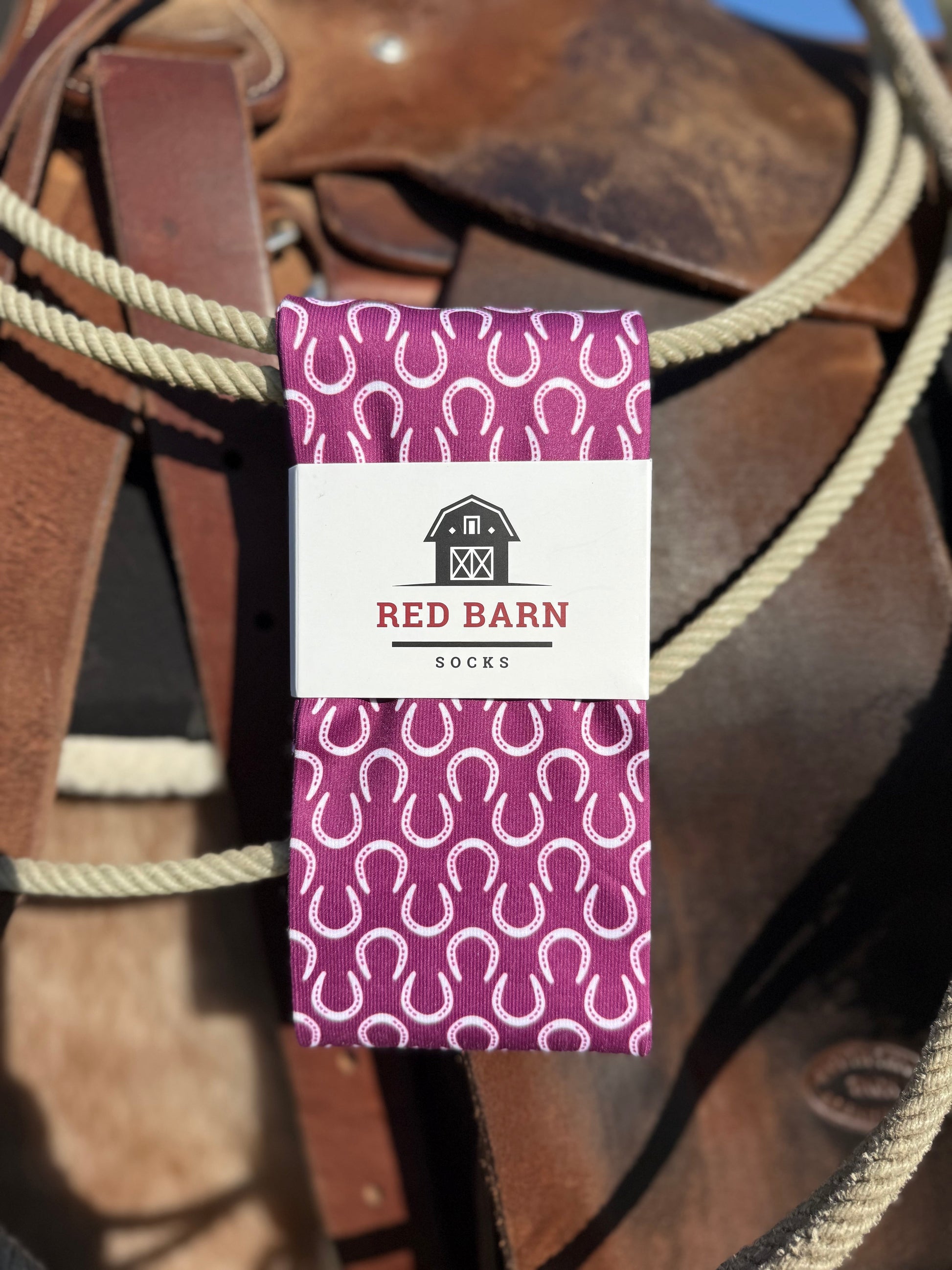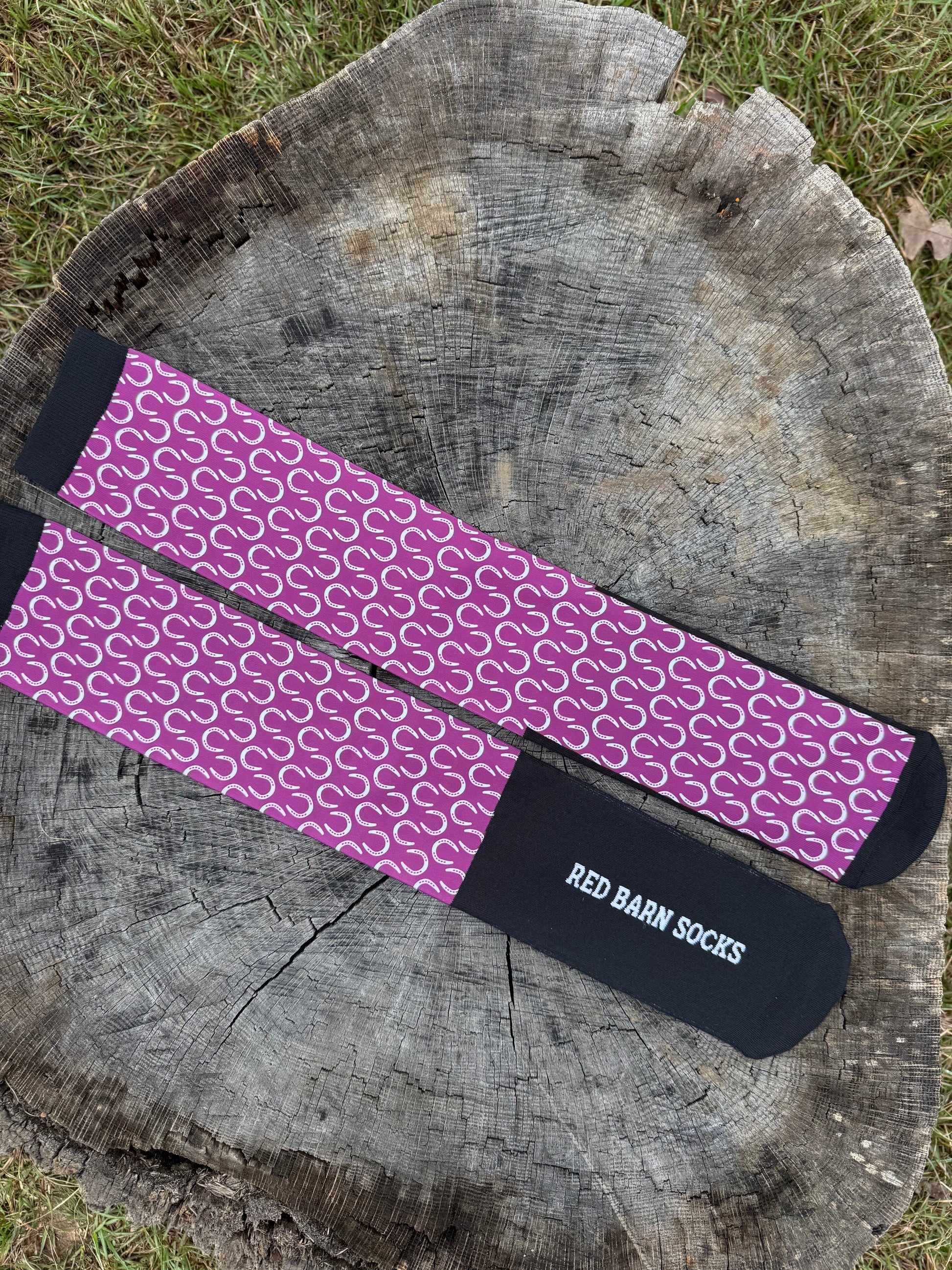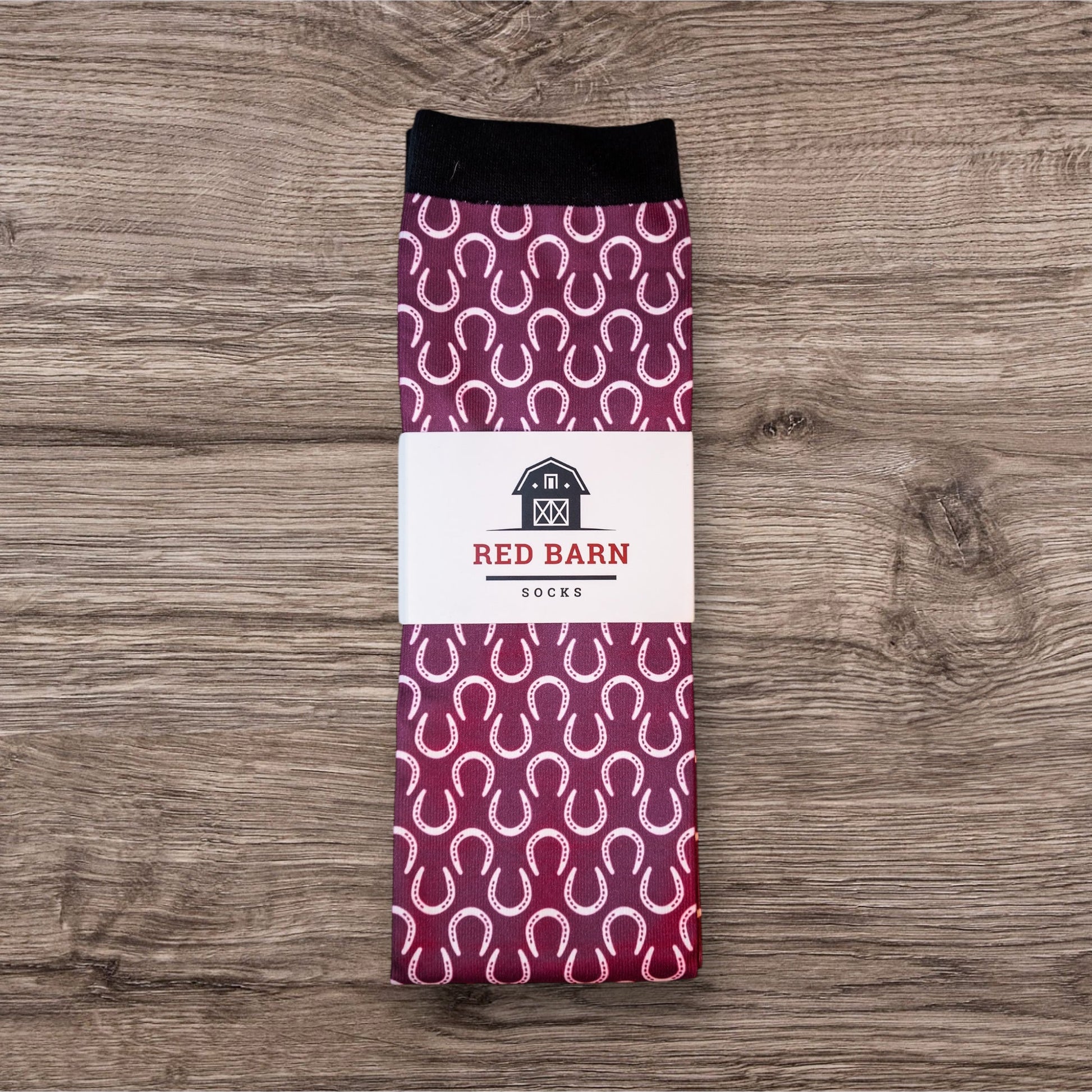 Step into the day with confidence and a little extra luck! Our Horseshoe Harmony socks come in a perfect plum color patterned with white horseshoes - perfect for anyone who lives life with grit, heart, and a touch of western flair. Made with breathable fabric, stay-up fit, and a seamless design, these socks aren't just good looking, they're built for comfort whether you're in the saddle, at the office, or kicking back after a long day.