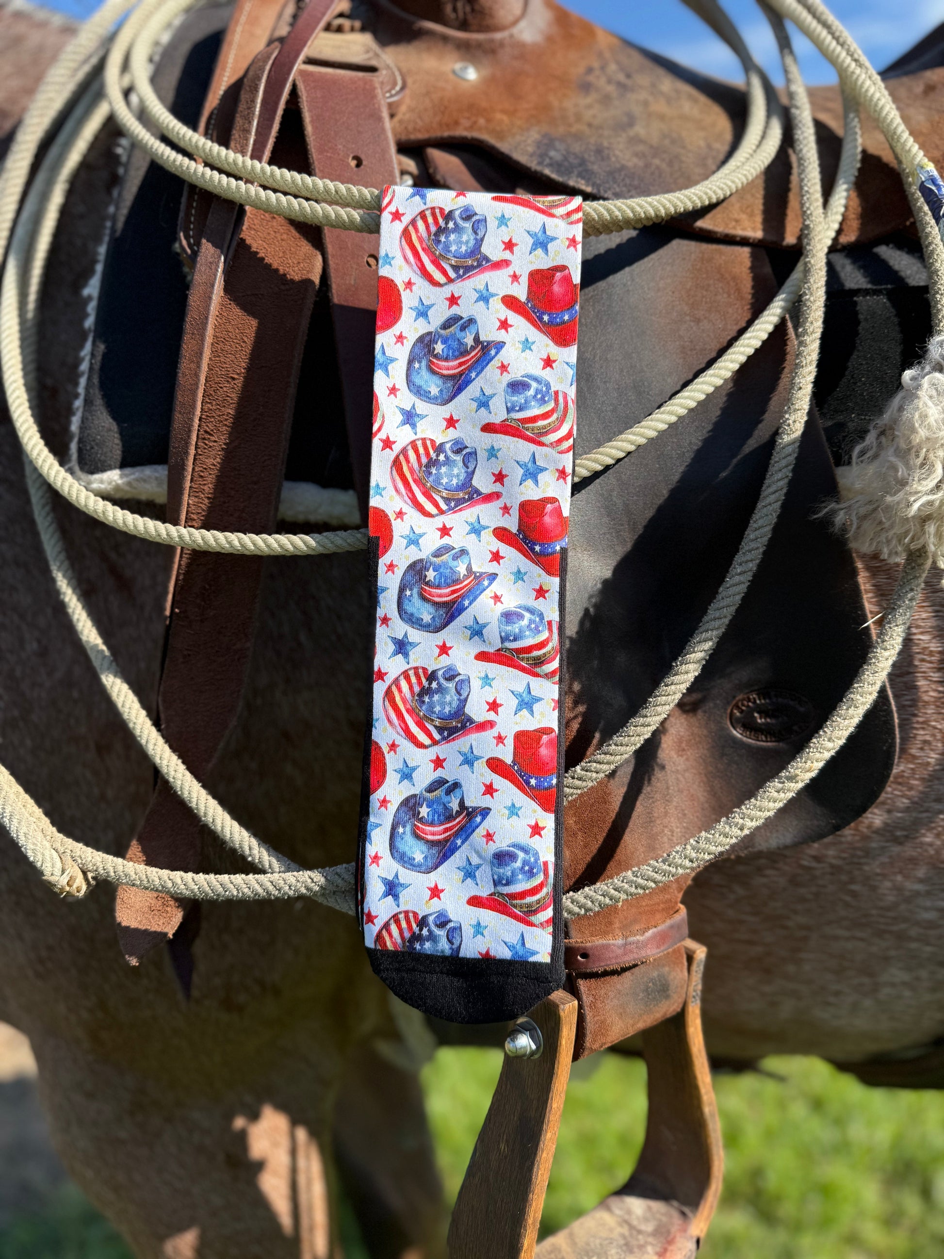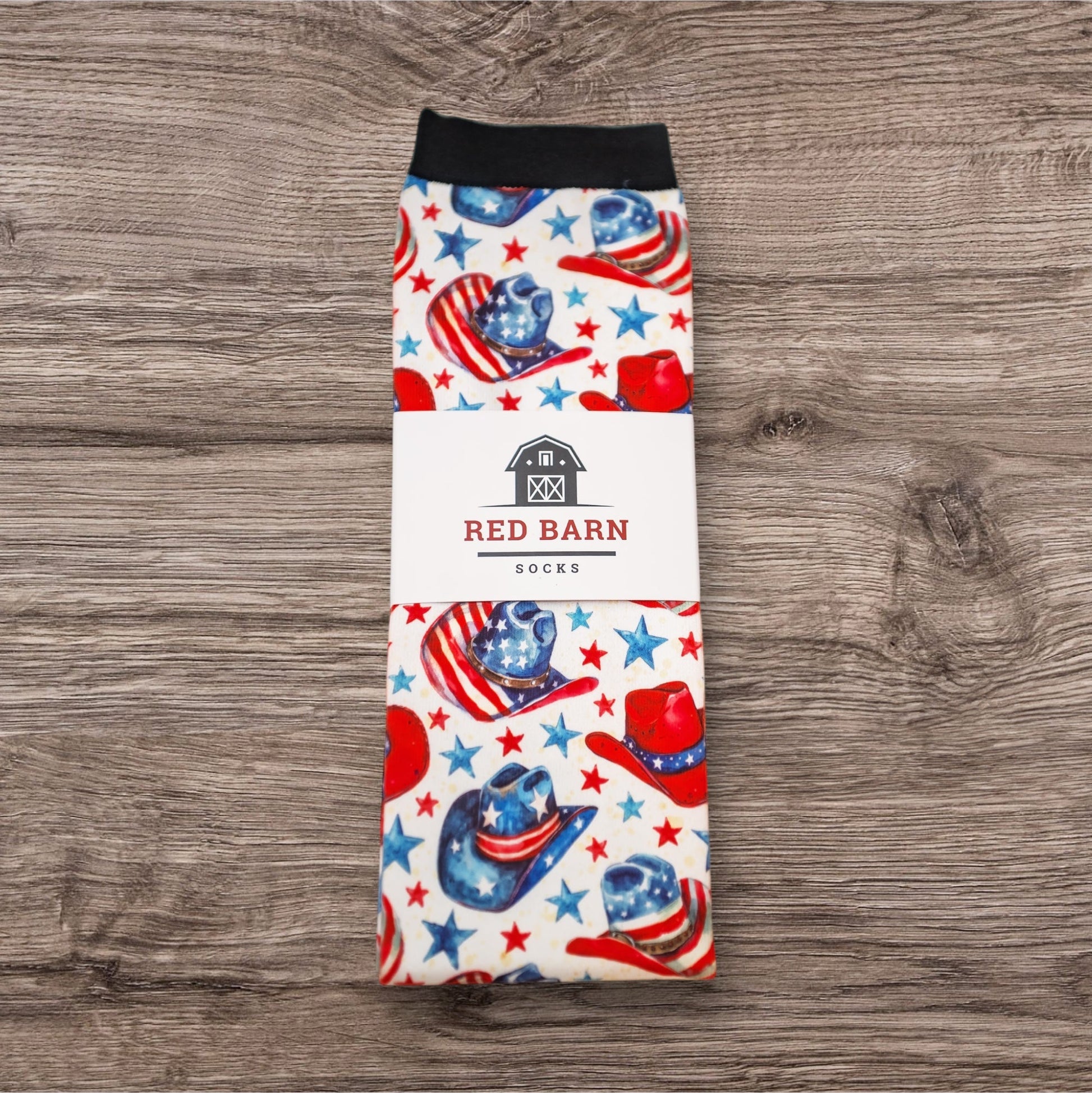 Bring a little American pride to your step with Howdy America - Red Barn Socks. This fun pattern featuring bold cowboy hats in red, white, and blue are perfect for 4th of July festivities! Made with our signature stay-up fit, seamless toe, and soft, breathable fabric, they're built for all-day comfort whether you are riding, working, or celebrating.