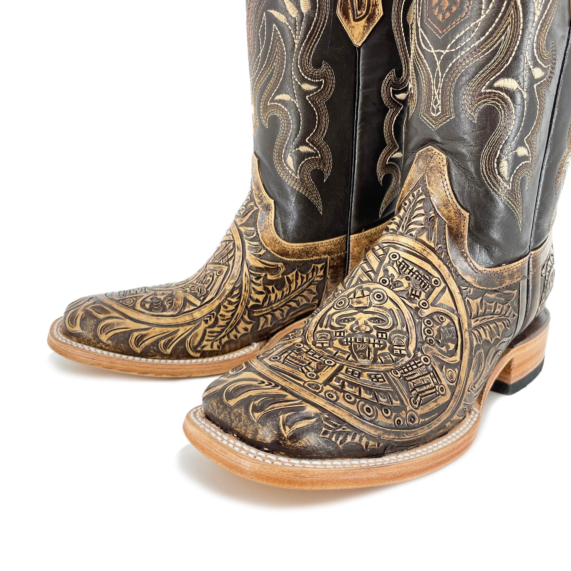 Men's Bulldog Hand Tooled Boots- Aztec Calendar Rustic