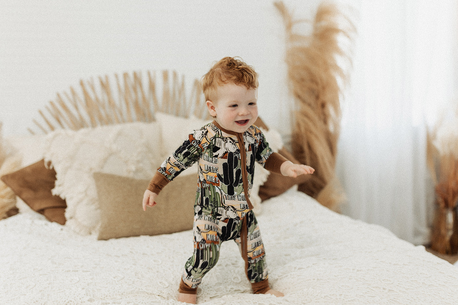 Saddle up for sweet dreams or adventurous days with the Bamboo Zipper Romper!