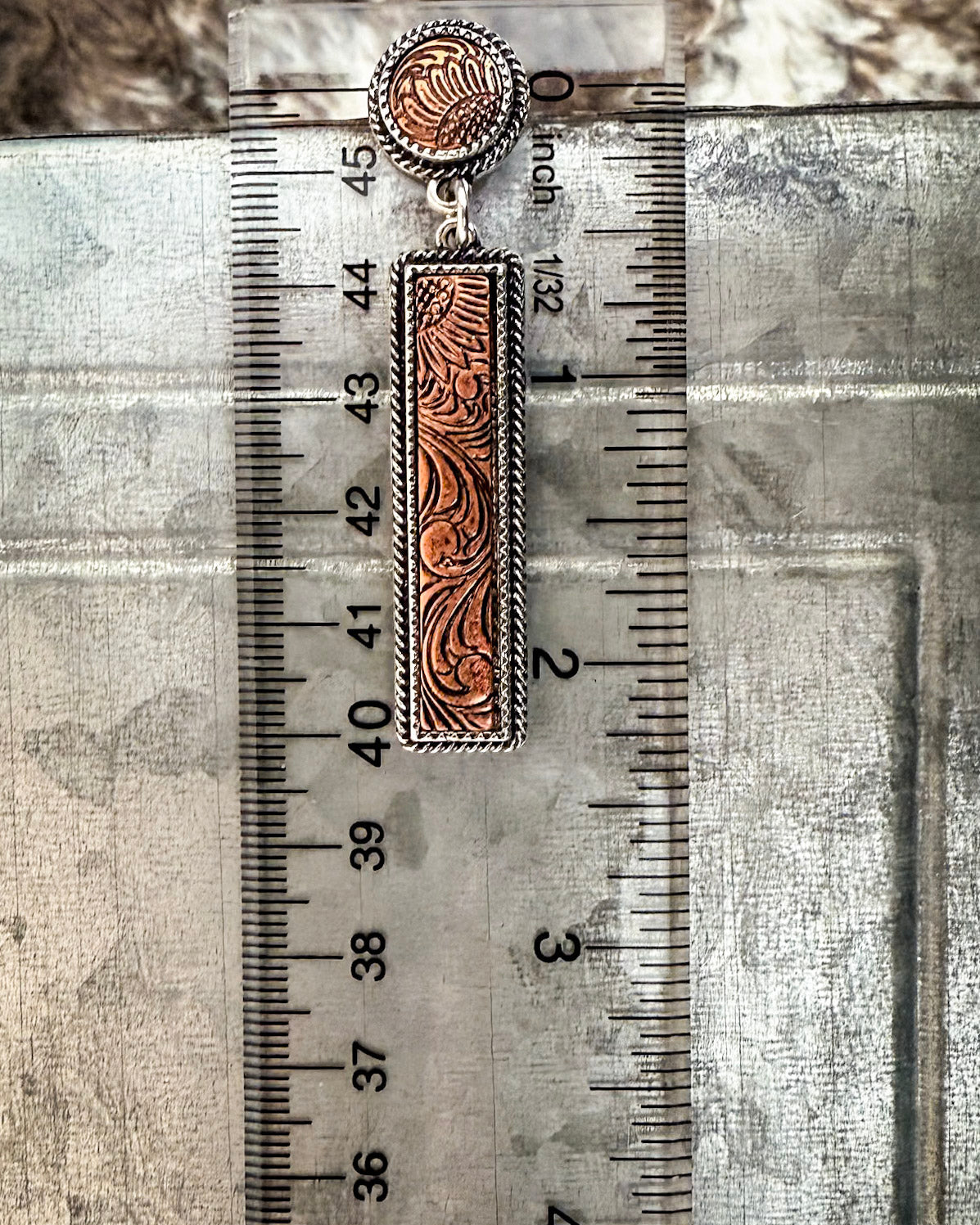 These stunners are handcrafted with care, featuring a beautiful mix of copper and silver tones that play off each other just right. The rectangular copper bars are engraved with intricate western scrollwork—think tooled leather vibes, but in jewelry form. Each one is framed in a silver-tone rope border that gives ‘em a bit of that vintage flair we all love. And let’s talk about the dangle—just enough length to catch the light, but not so long they’ll get in your way. Lightweight, easy to wear, and effortlessly cool.
