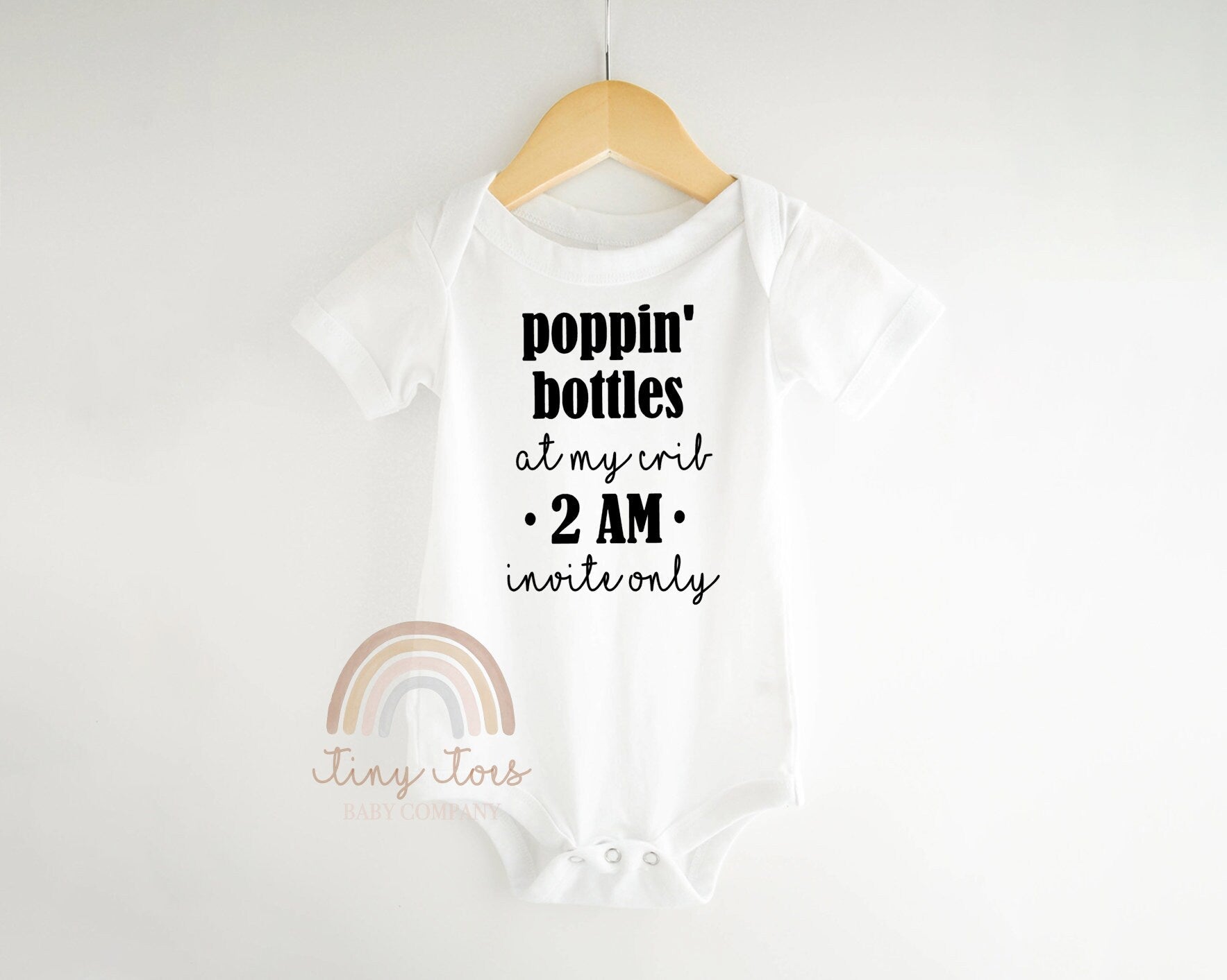Poppin' bottle at my crib, 2AM invite only baby bodysuit. Our bodysuits feature buttery soft cotton, perfect for babies delicate skin, and make the most adorable gift!
