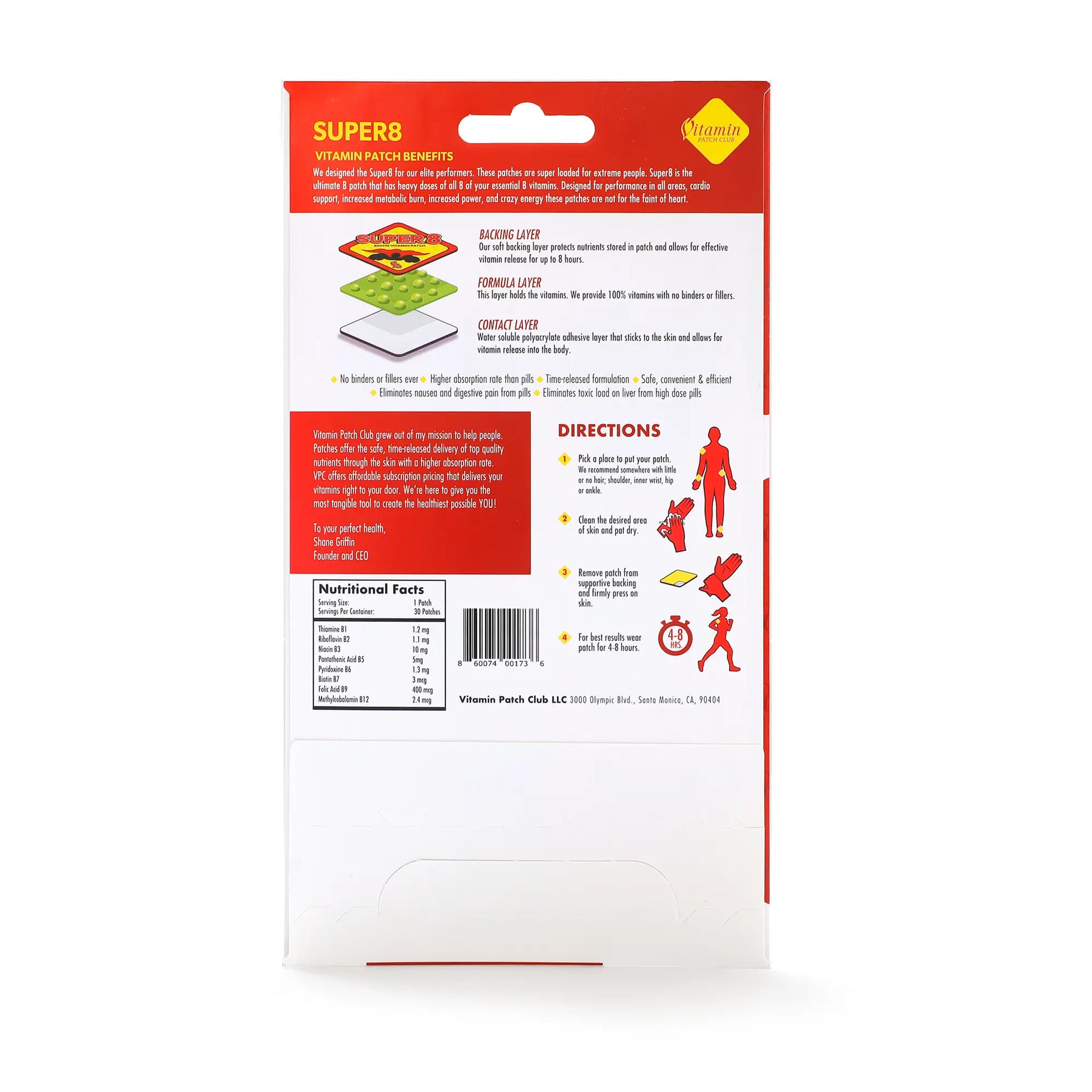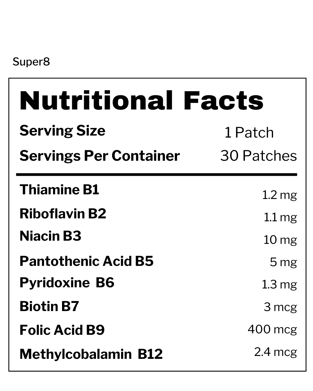 This patch isn't just bigger and bolder, but packs a punch. Some of our top-performing clients report a unique sensation of tasting the vitamins. Initially intended for pro athletes and clinical settings, we're now offering the Super8 to the general public for the first time.