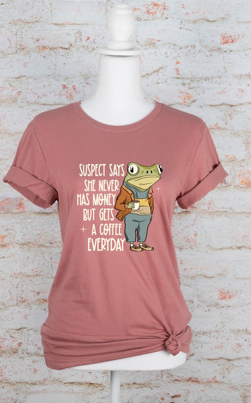 Get ready to make a statement with our Suspect never has Money Coffee Graphic Tee! This bold and stylish tee is perfect for those who never want to compromise on style or comfort. Say goodbye to boring tees and hello to a coffee-inspired, sassy look that will make you stand out from the crowd. Perfect for any coffee lover, this tee is a must-have addition to your wardrobe.