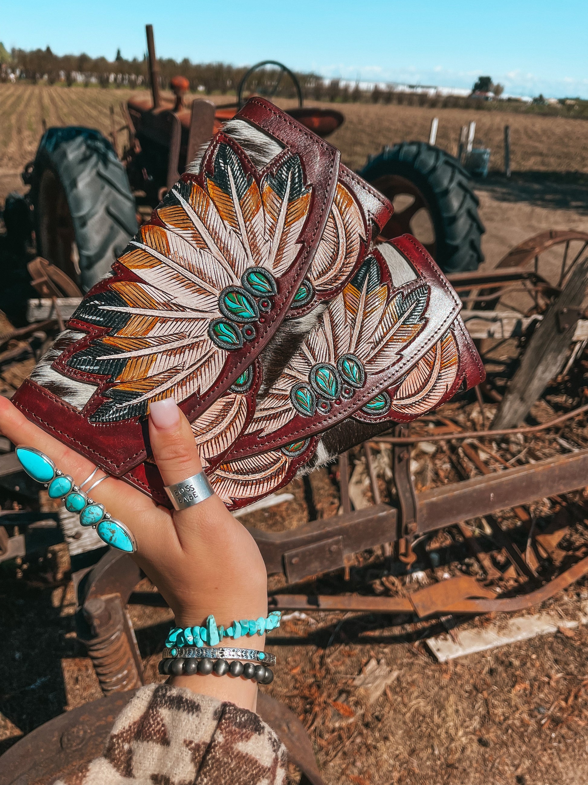 Introducing The Hunters Wife Wallet, a unique and complete one of a kind necessity! She features a beautiful bunch of feathers and a absolute perfect squash blossom under her flap.