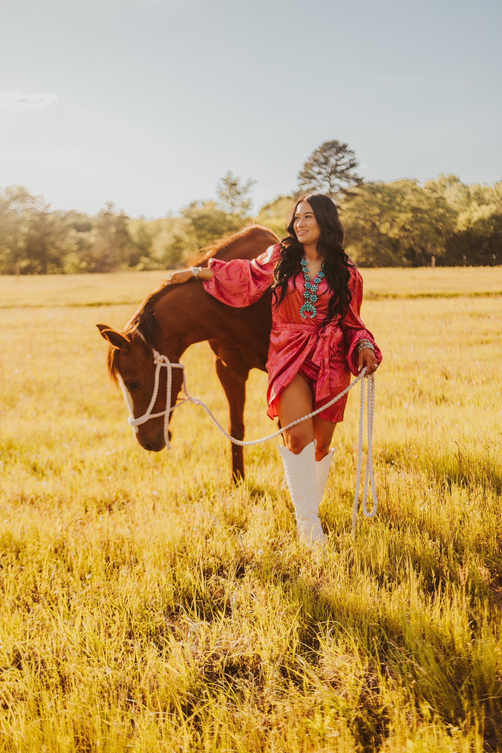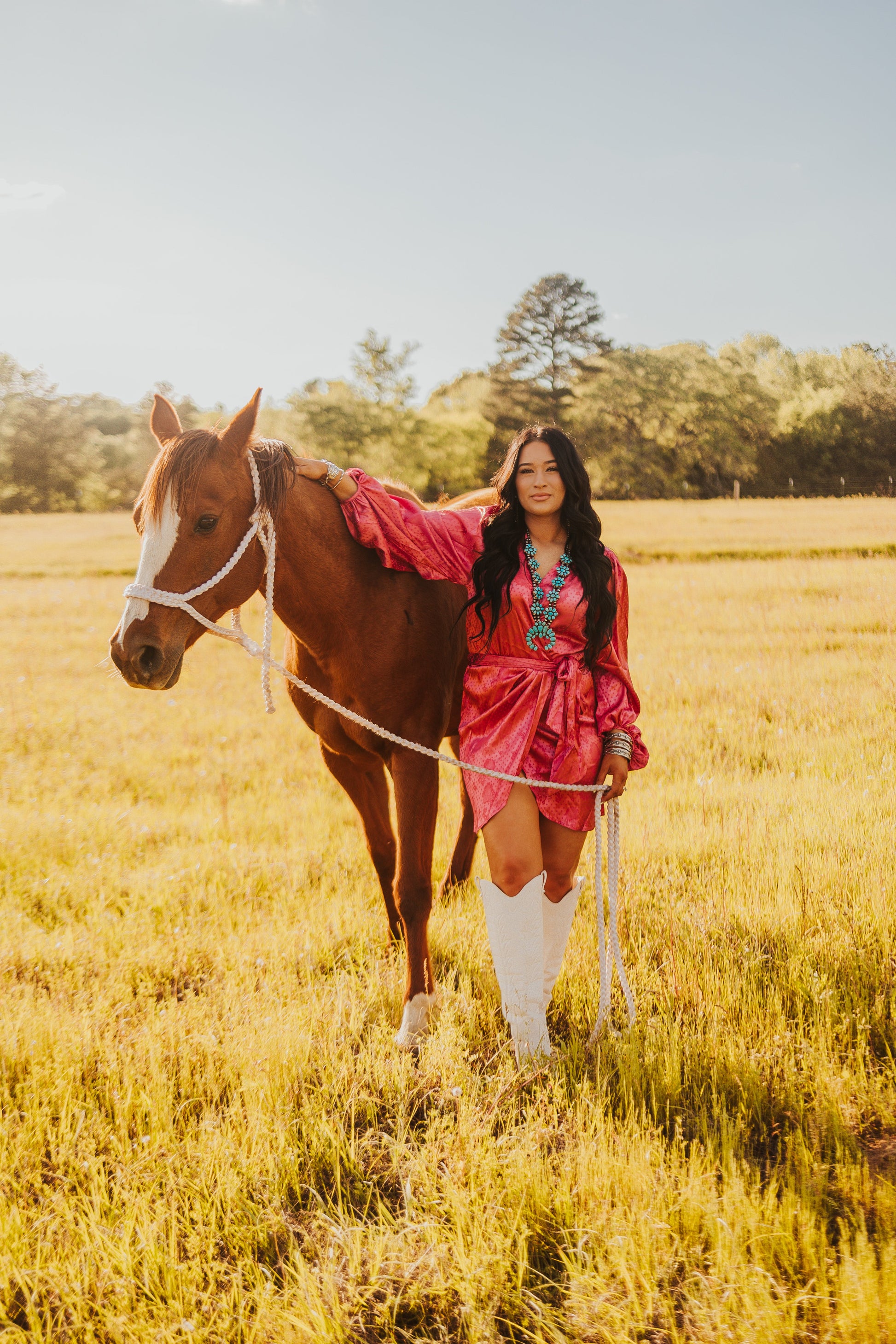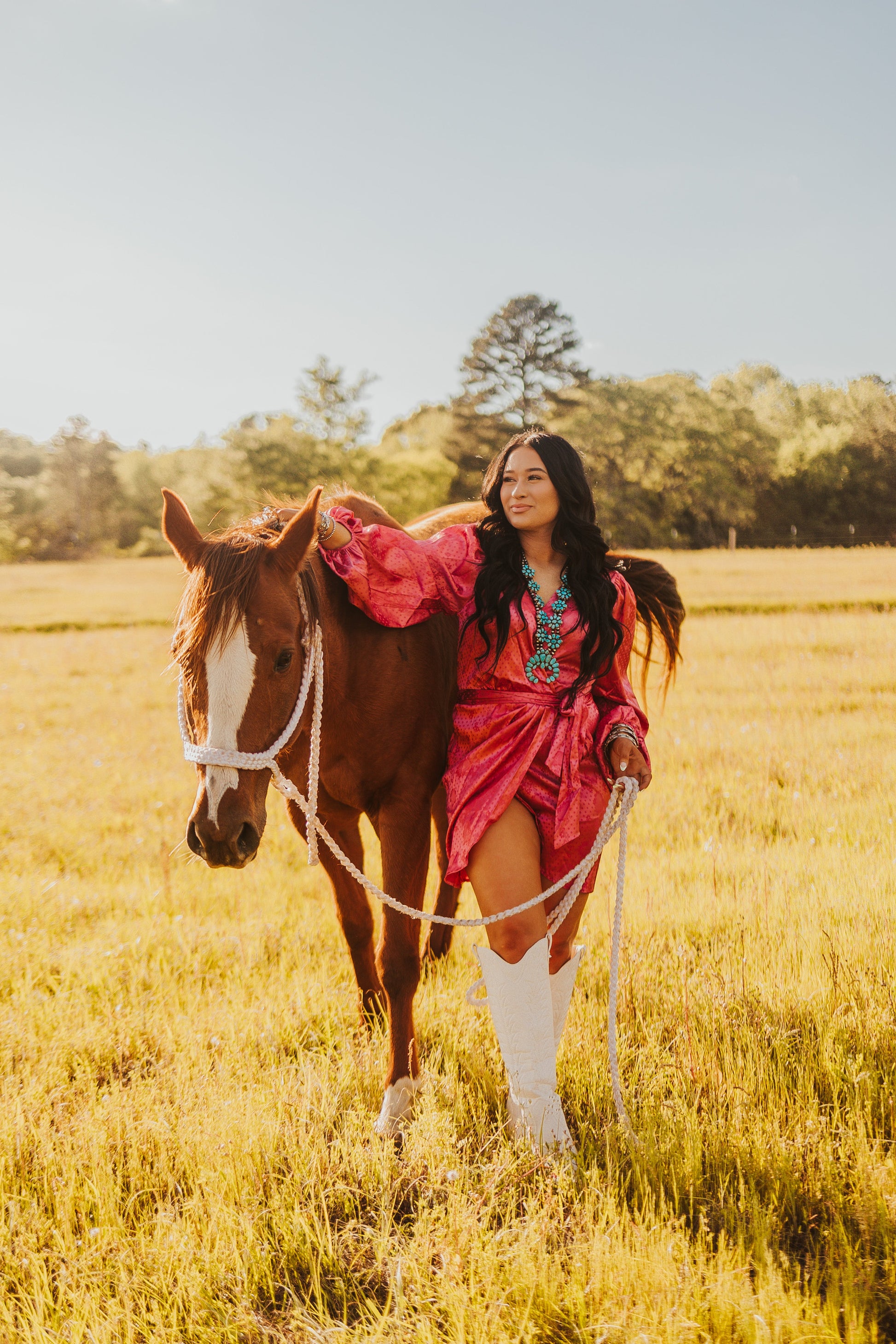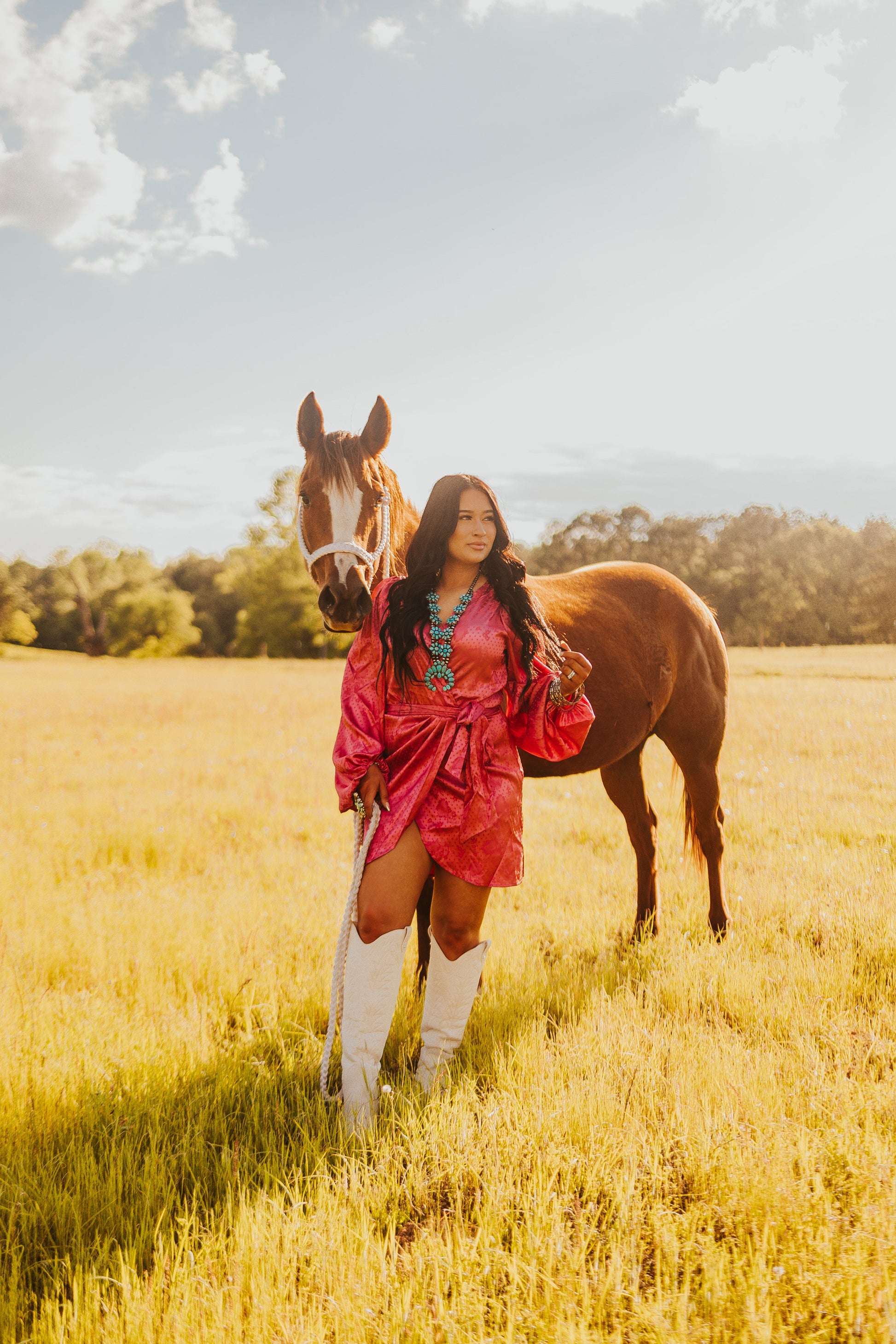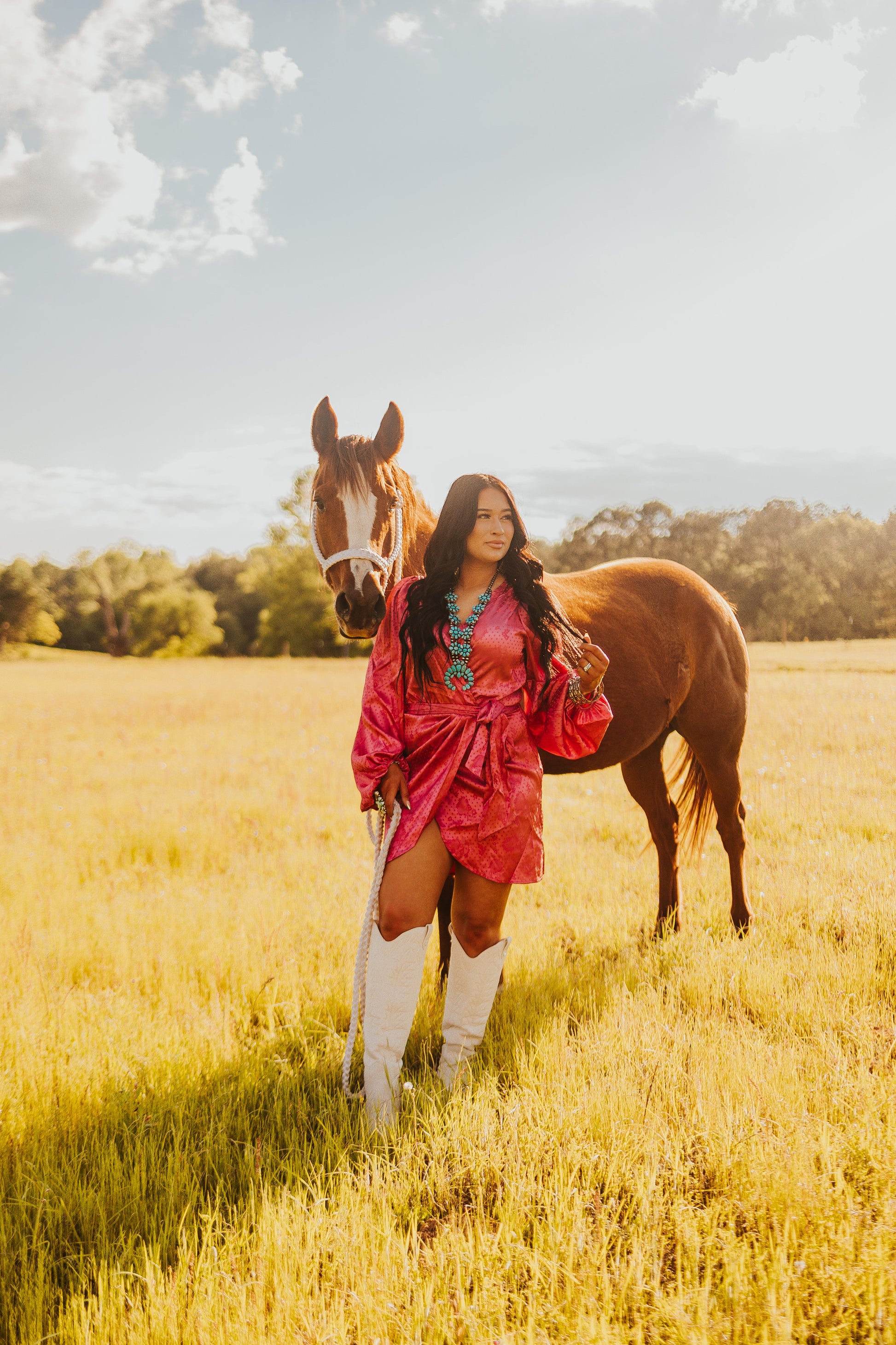 Pink long balloon sleeved wrap dress in a satin jacquard fabric material.