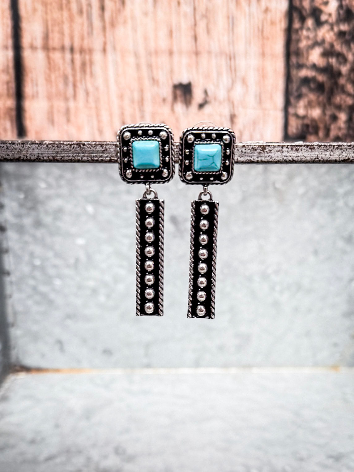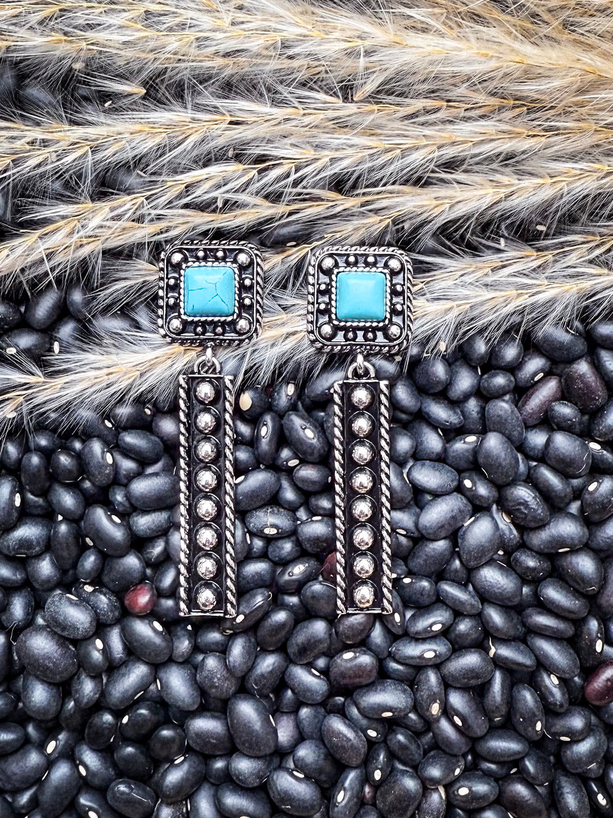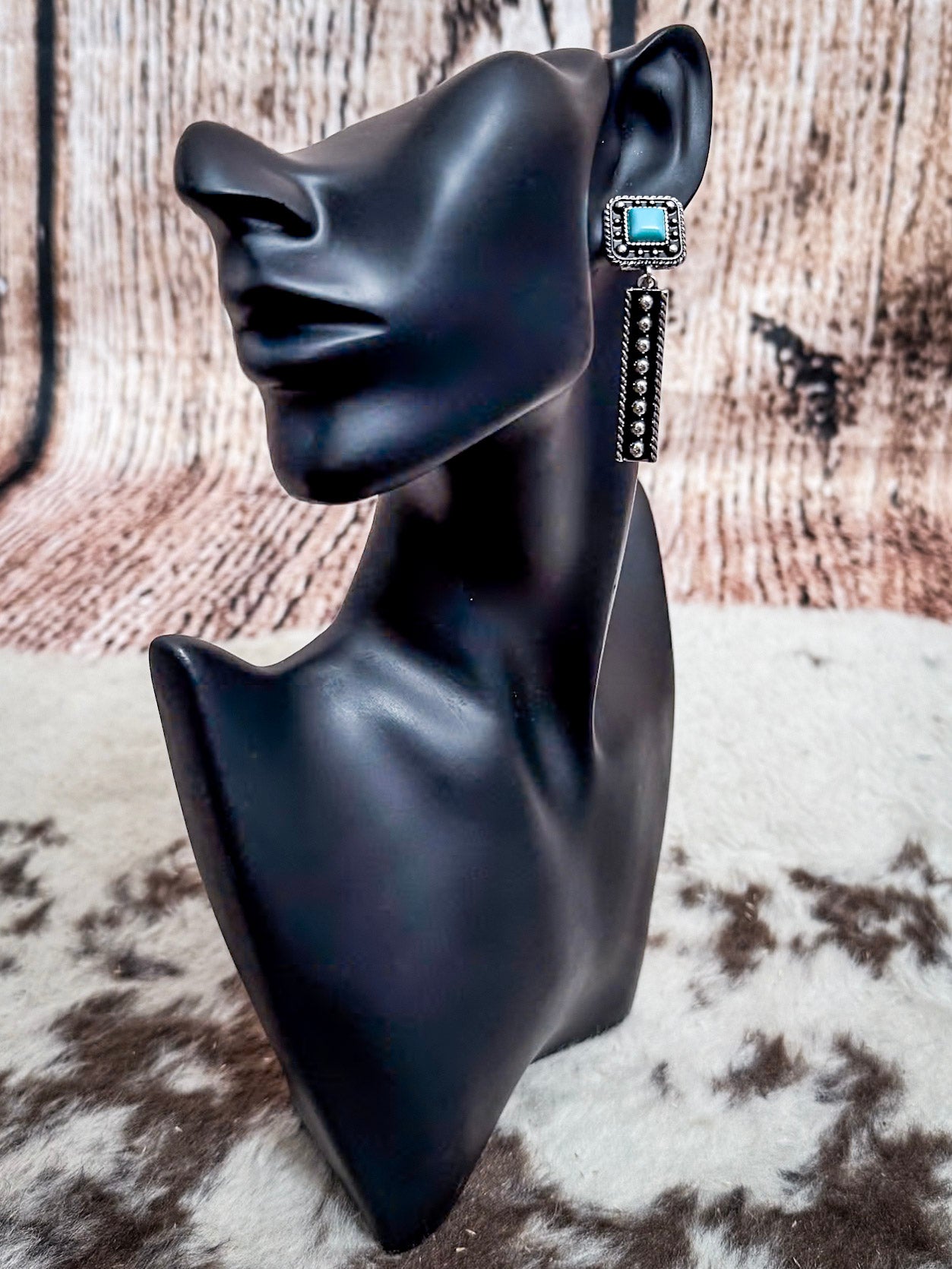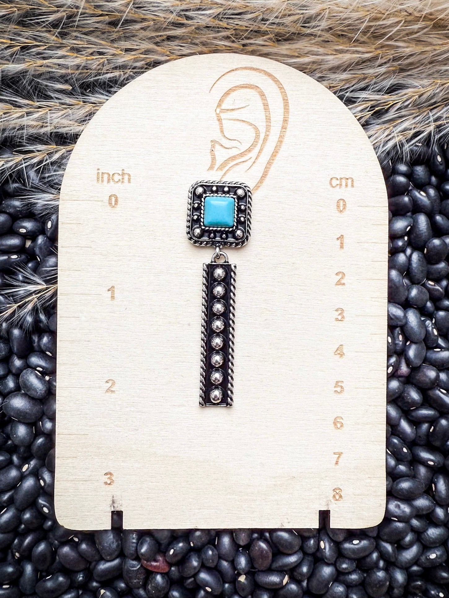 Meet The Silverado Bars—a sleek, silver-toned pair with just the right amount of edge. These drop earrings feature a square stud top with a bright aqua stone, paired with a long bar drop accented by western-style beading. They’re bold, balanced, and made to turn heads (without weighing your ears down).