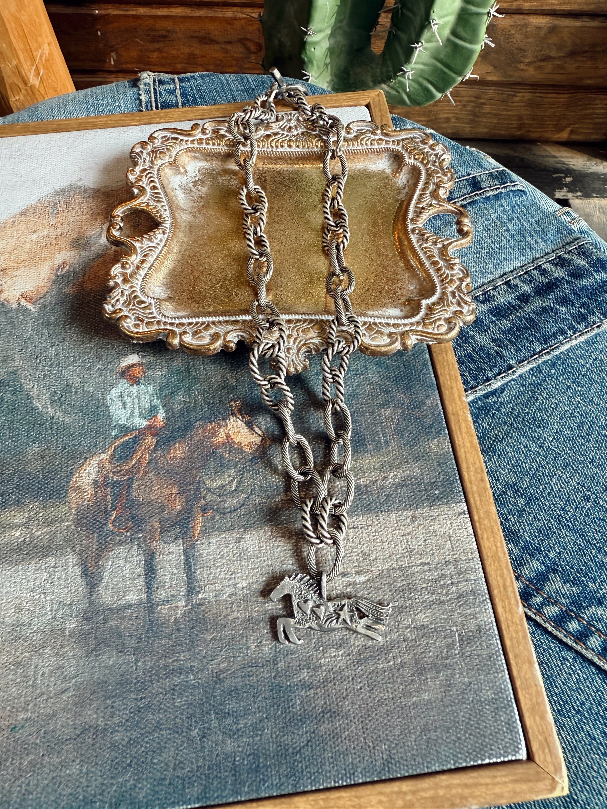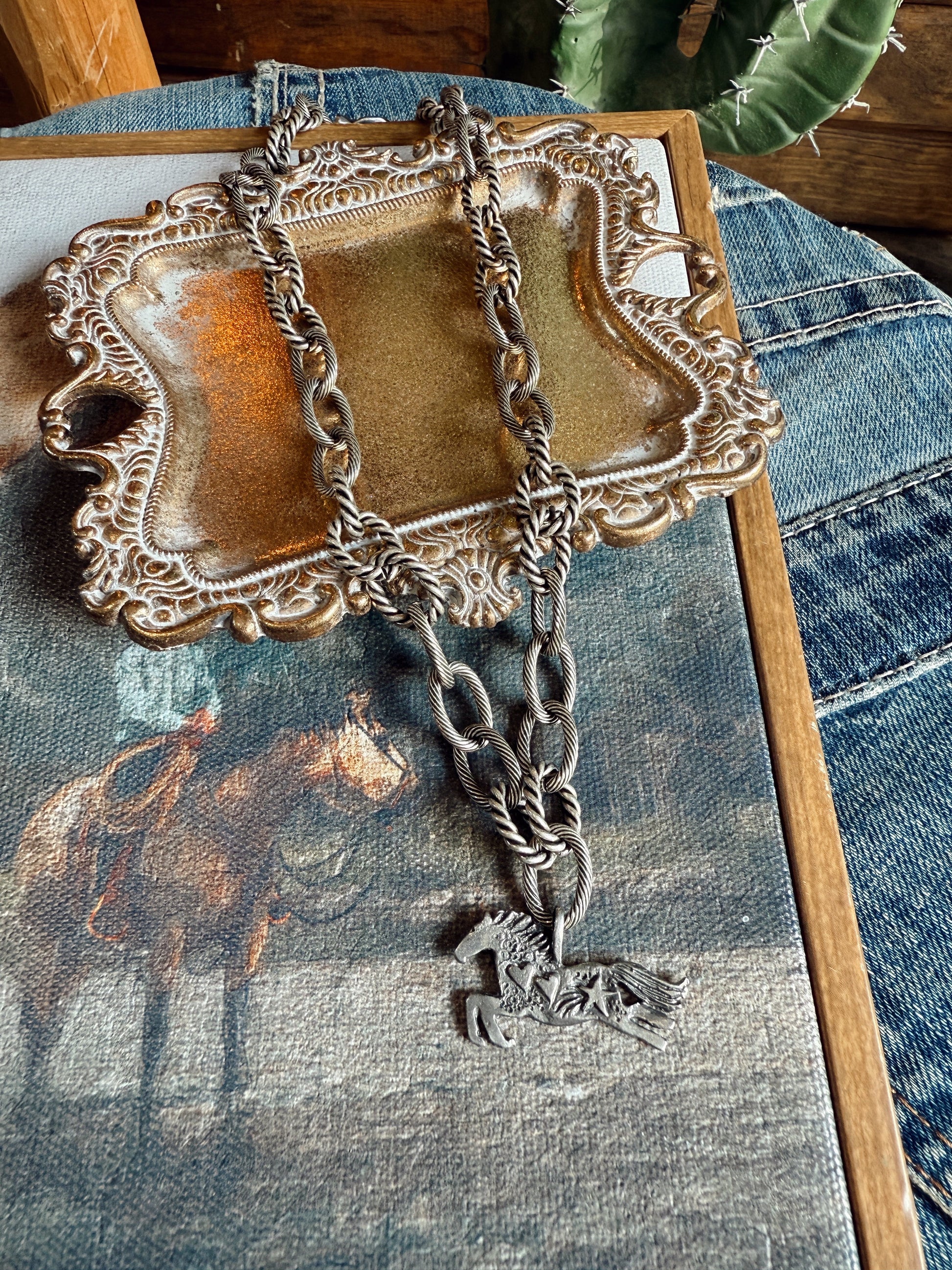 Designed and created by me, a rodeo wife in Texas, USA, the “Stardust Stallion” necklace blends western spirit with celestial magic. A 16" twisted antique silver rope chain with an easy toggle clasp holds a detailed pewter pendant of a horse set among stars and moonlight. Most of my materials are sourced from the USA, and my rodeo roots inspire every piece. All materials are artisan and handmade, so slight variations add unique character. Normal jewelry care for plated pieces applies — avoid water, lotions, and perfumes to keep it looking its best.