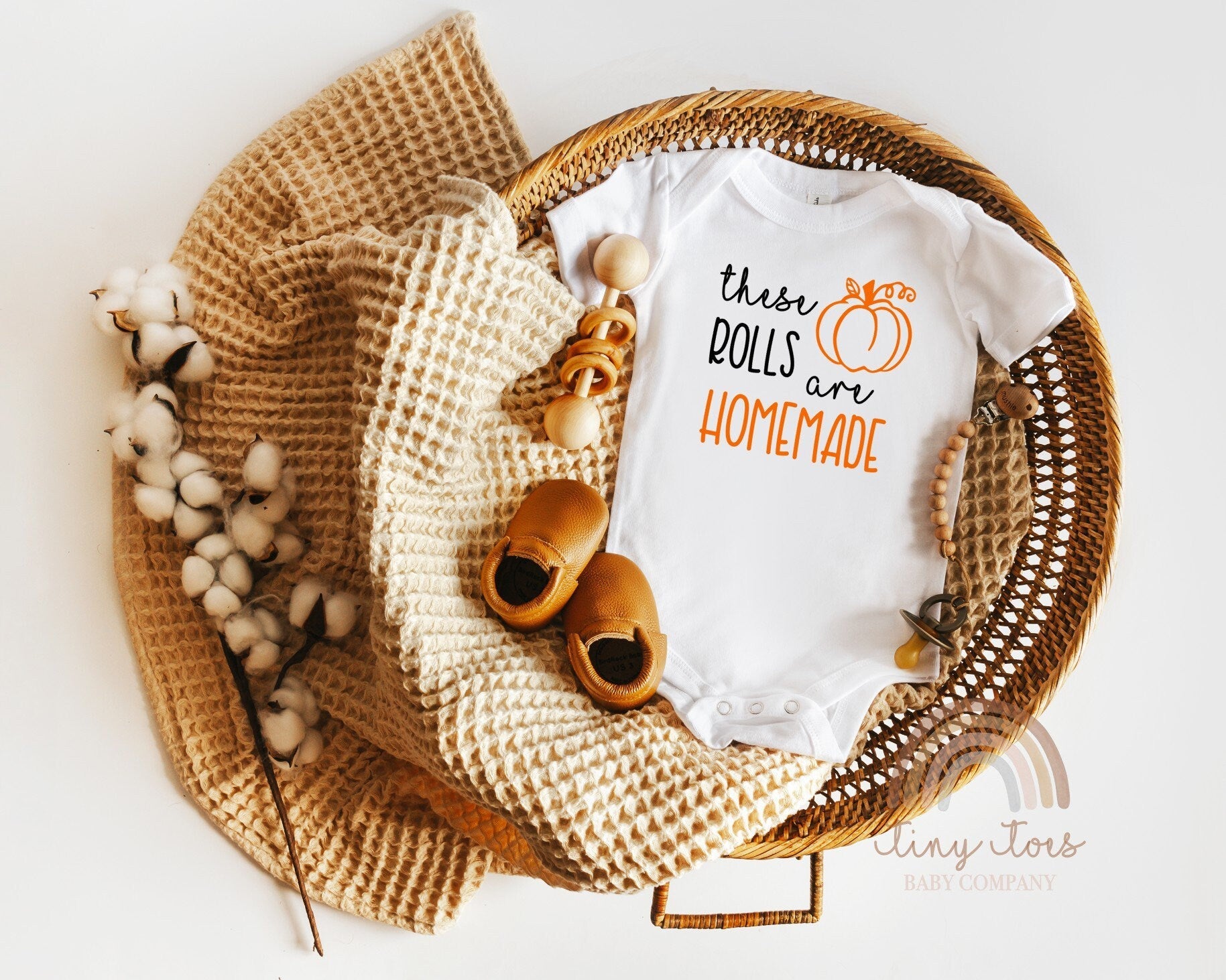 These rolls are homemade, first Thanksgiving baby bodysuit. Our bodysuits feature buttery soft cotton, perfect for babies delicate skin, and make the most adorable gift!