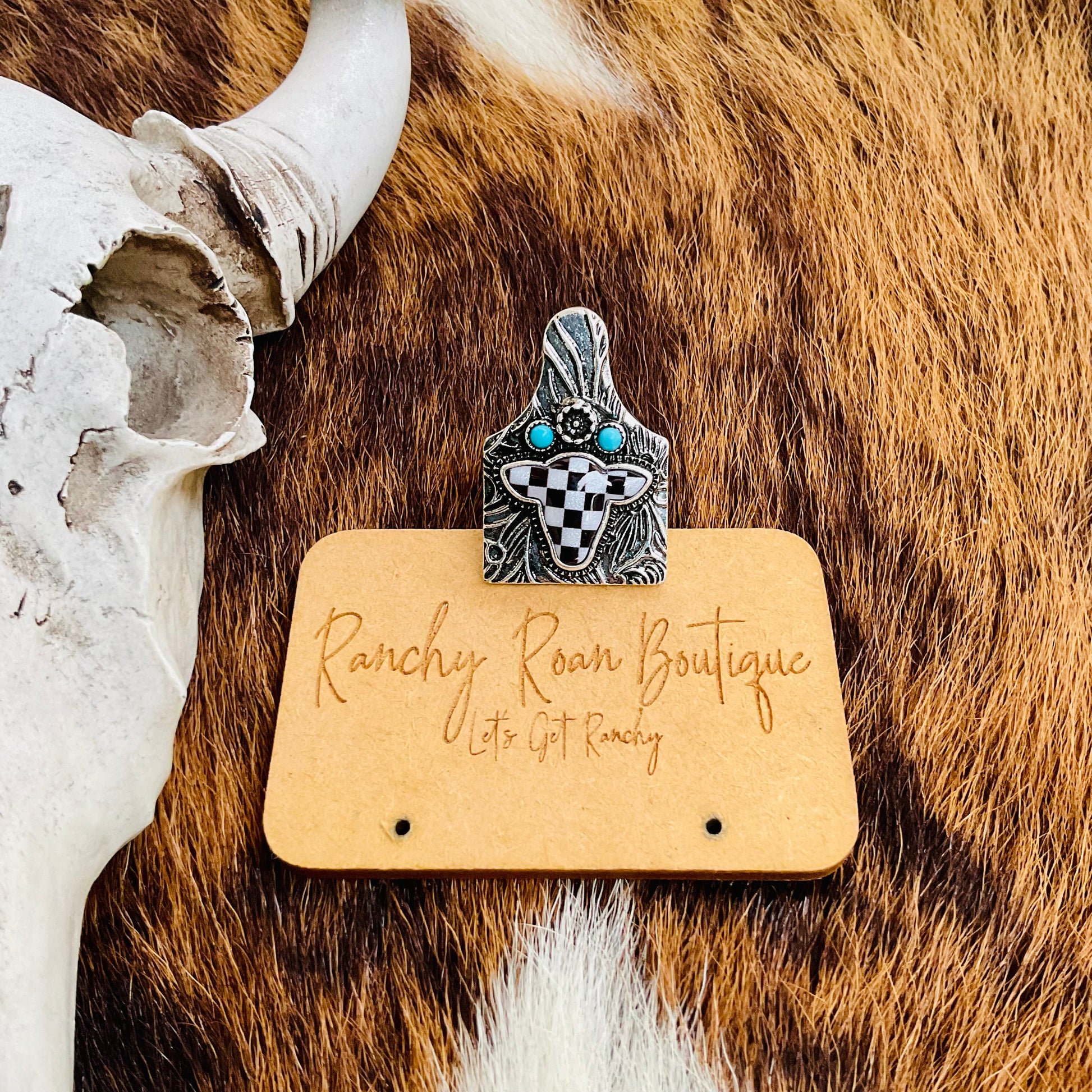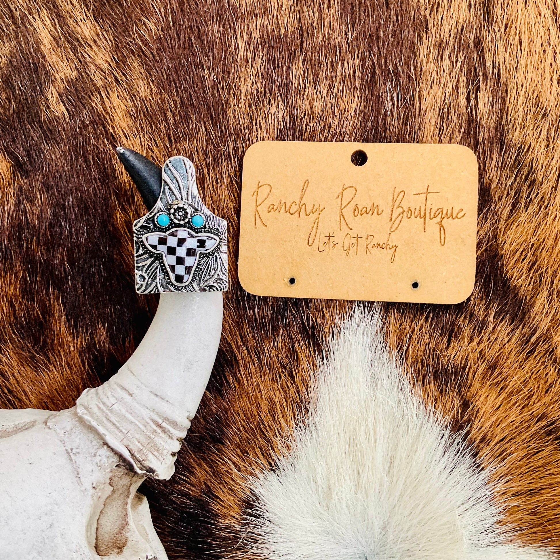 Add a touch of rustic charm to your boutique collection with this Western Checker Cow Head Cuff Ring. Featuring a cow tag design adorned with a checkerboard cow head and turquoise accents, this adjustable cuff ring is a unique and stylish accessory. Perfect for layering or as a stand-alone statement piece, this ring is a must-have for any Western-inspired collection.