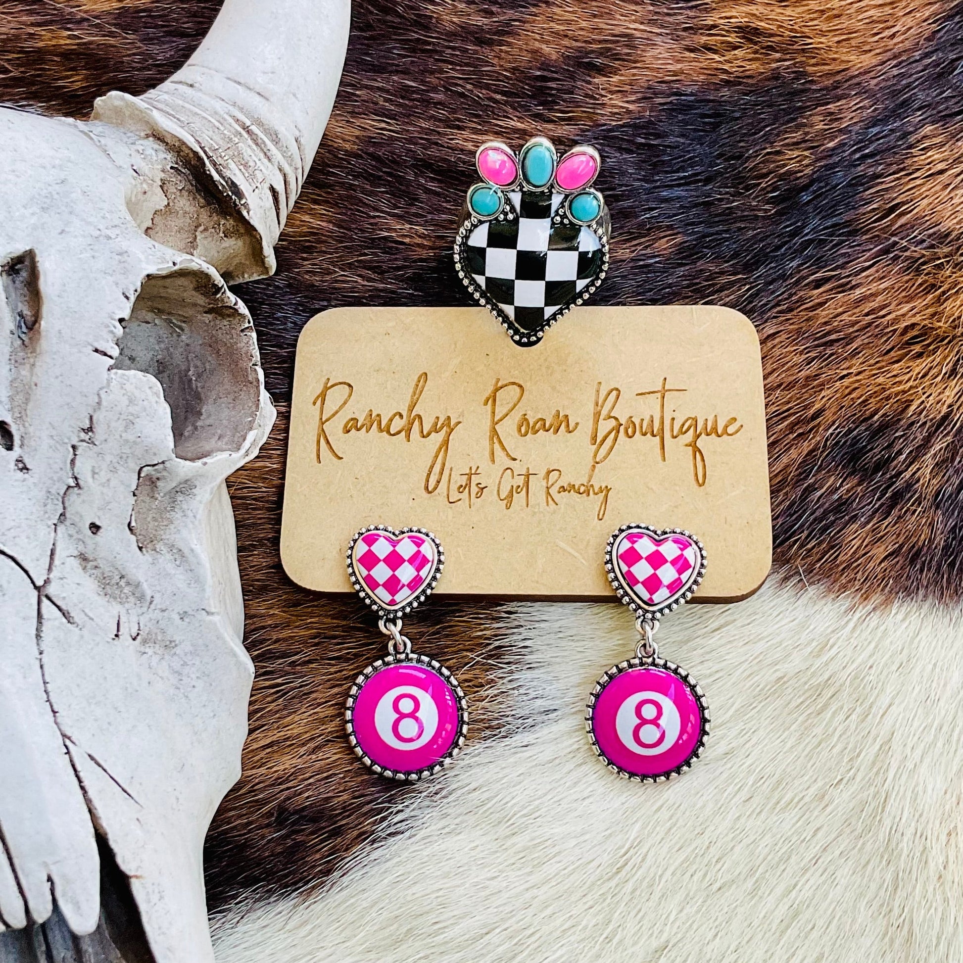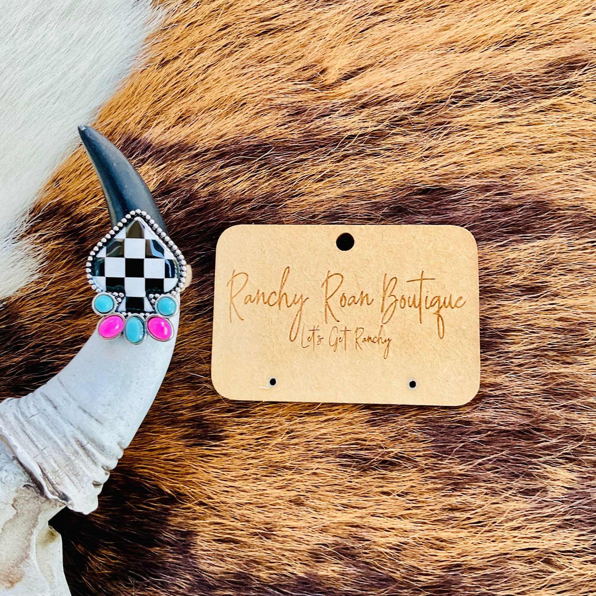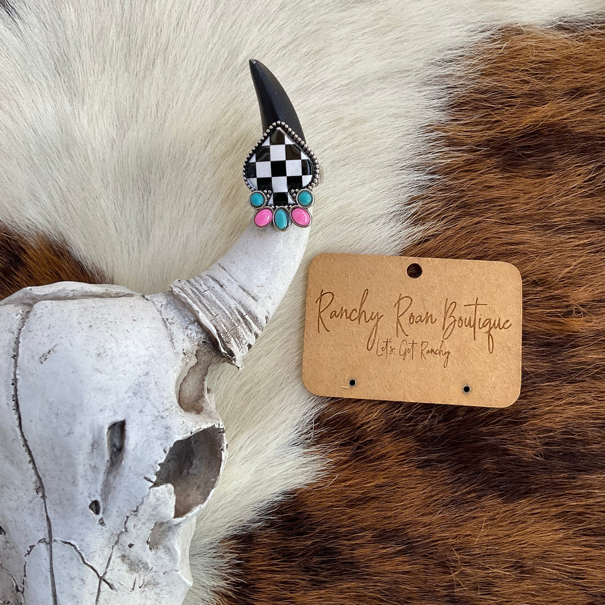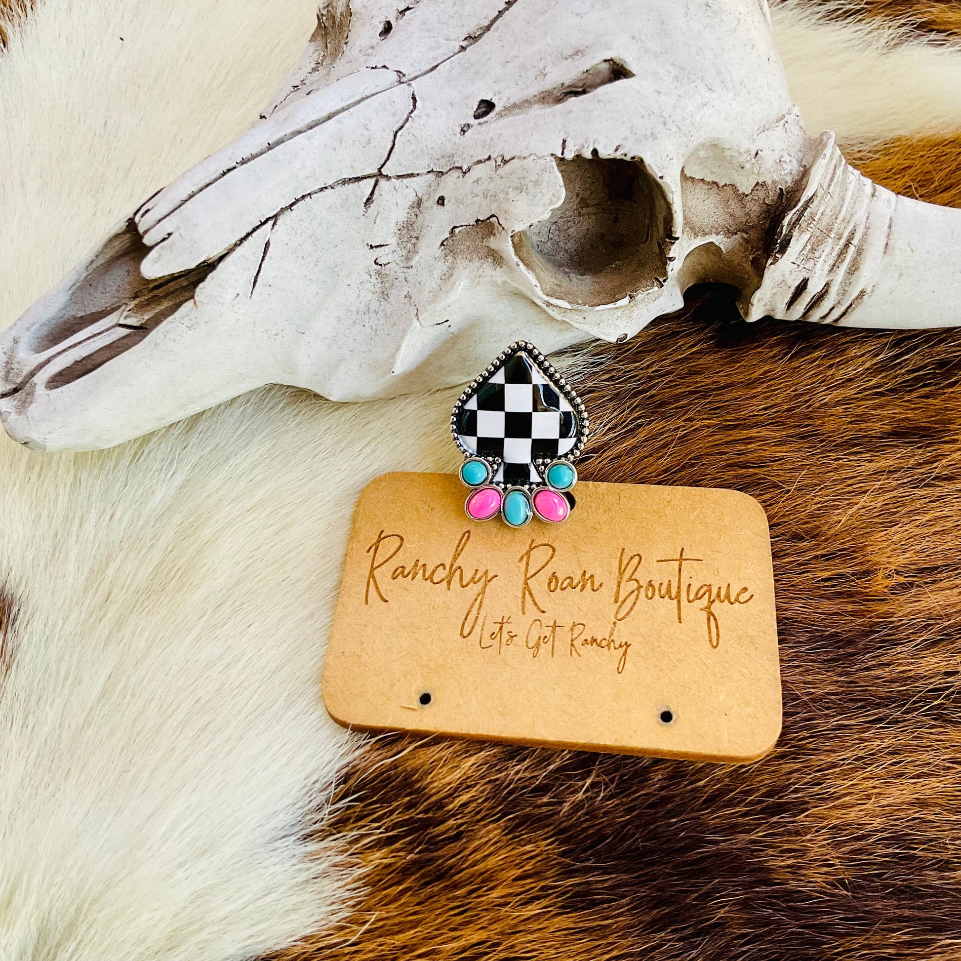 Add a touch of bold Western charm with this Checker Spade Stretch Ring. Featuring a unique black and white checkered spade design with turquoise and pink accents, this adjustable ring is perfect for any Western-inspired jewelry collection. Its stretch band ensures a comfortable fit for all sizes while keeping your style ranch-ready.