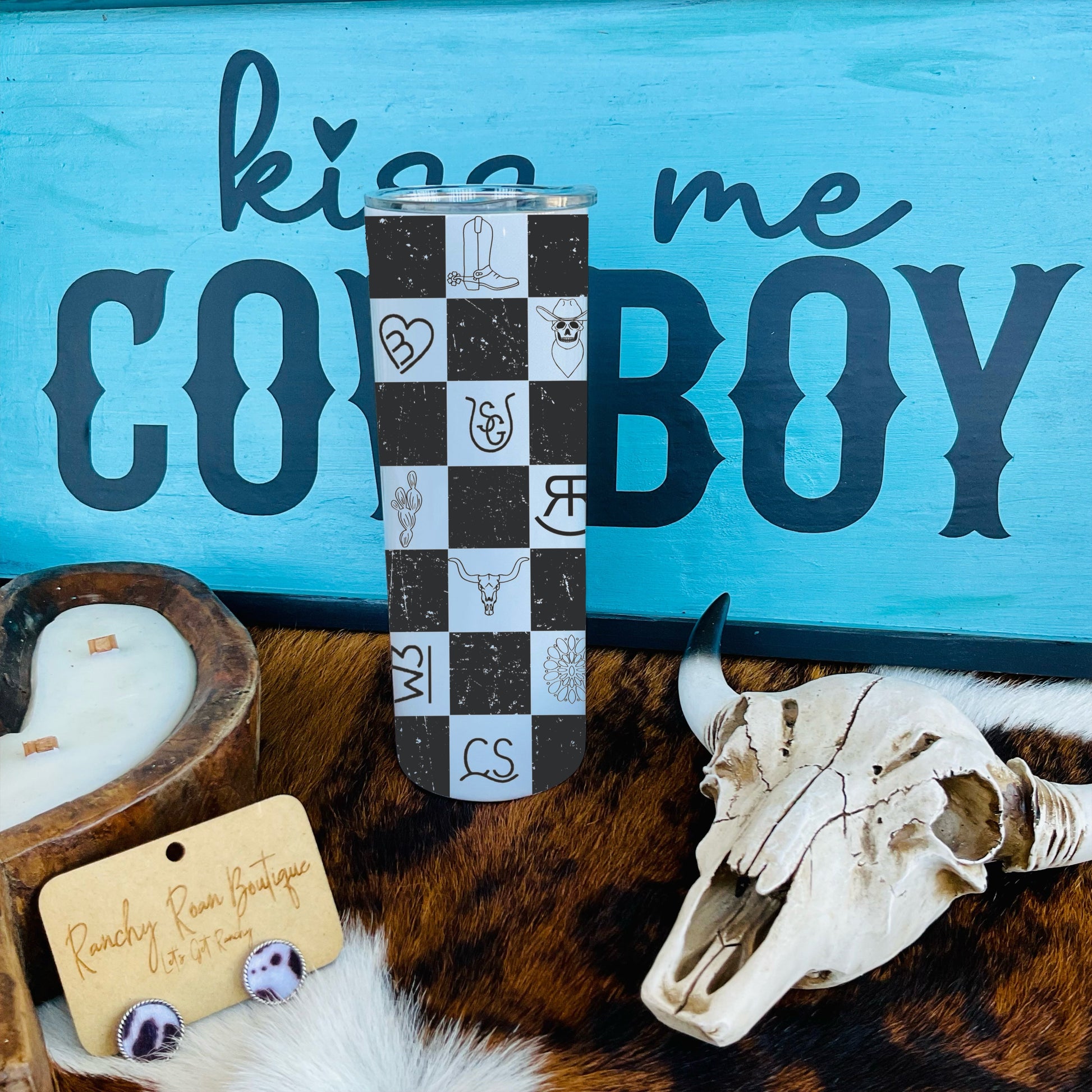 • Checkered pattern with Western icons, adding a unique touch to any drinkware lineup