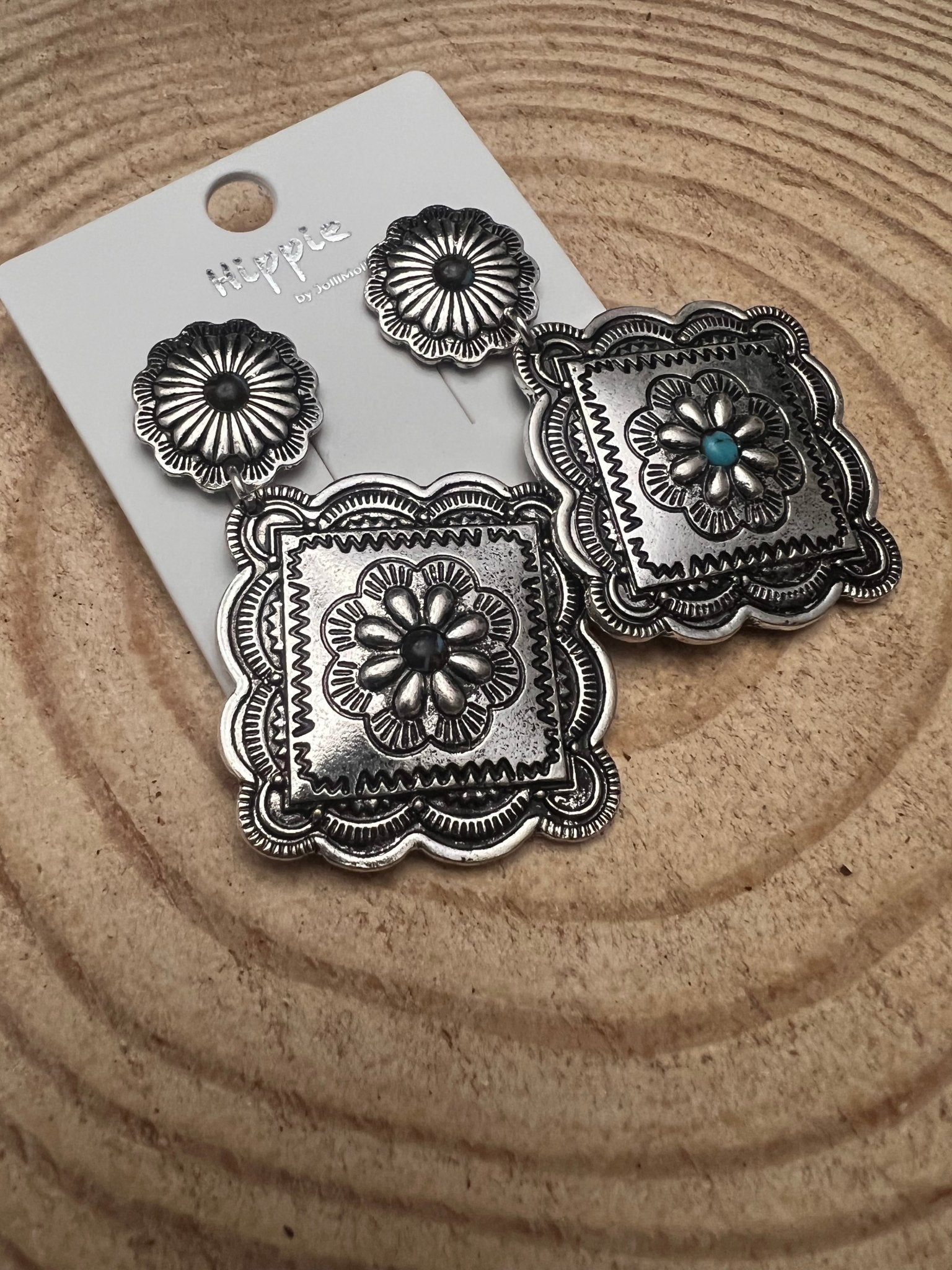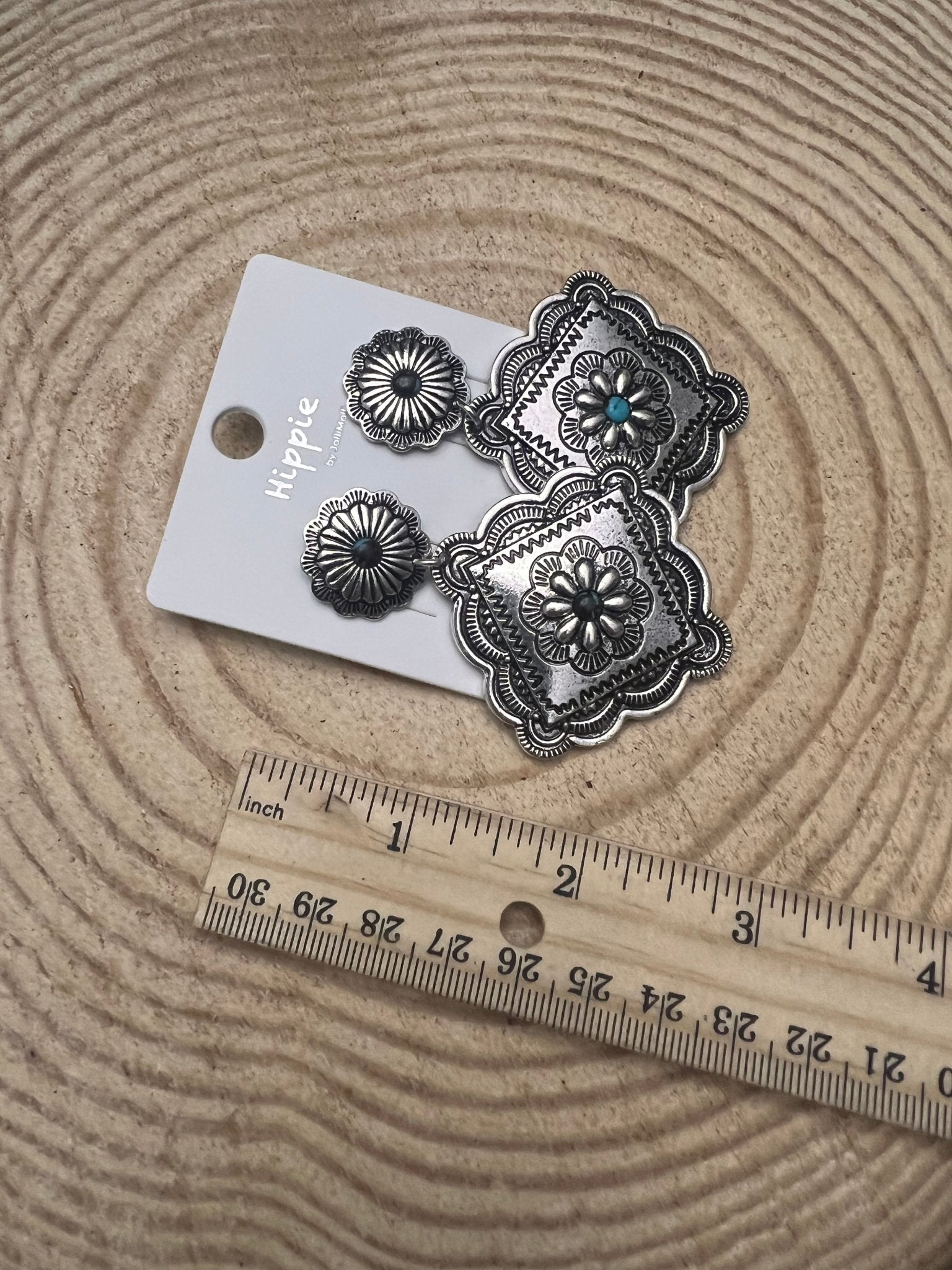 Western Concho Dangle Earrings with multi color stones - 2 1/2 inch drop
