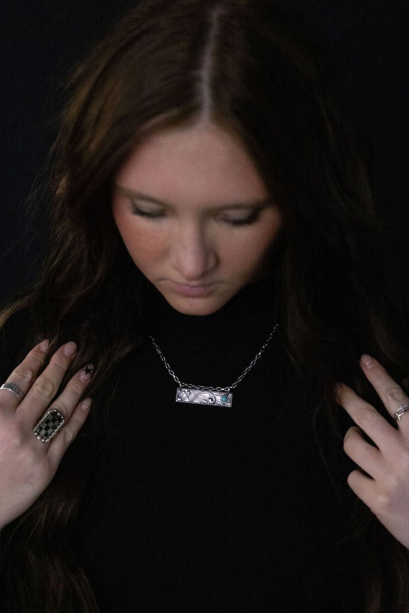 Western Faux Tooled Bar Necklace with Faux Turquoise - 18 inch + 3