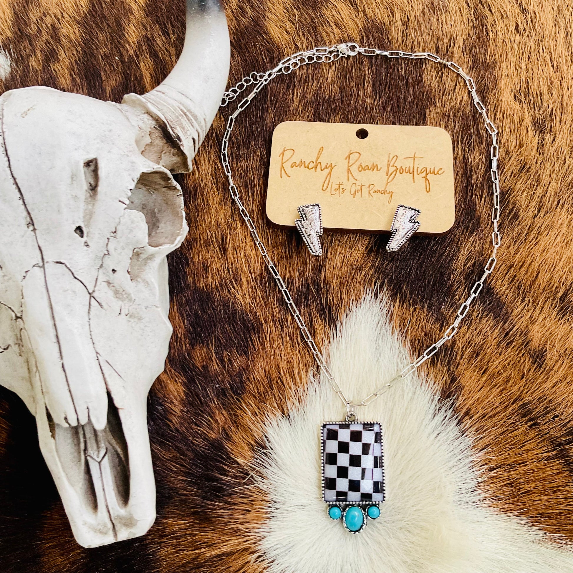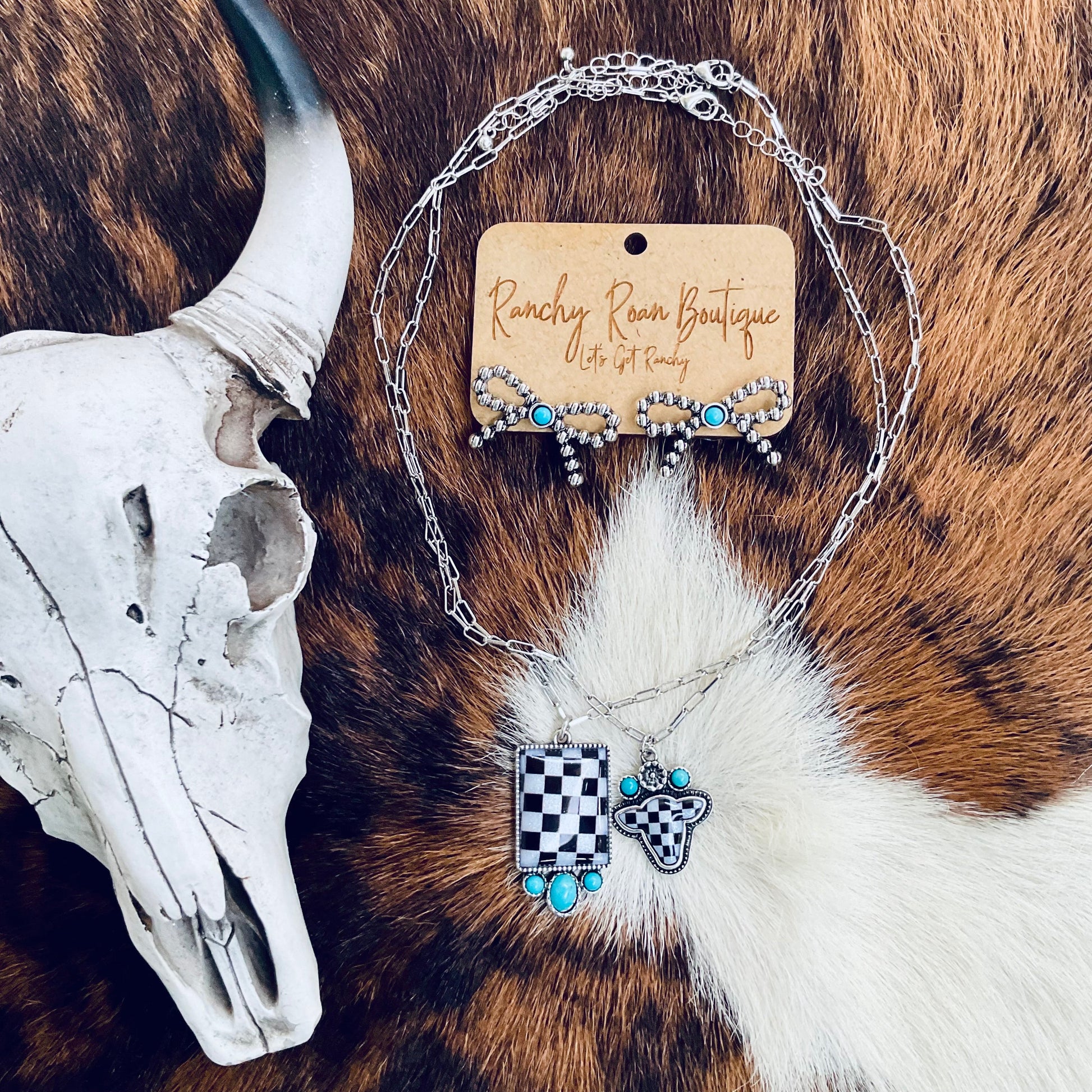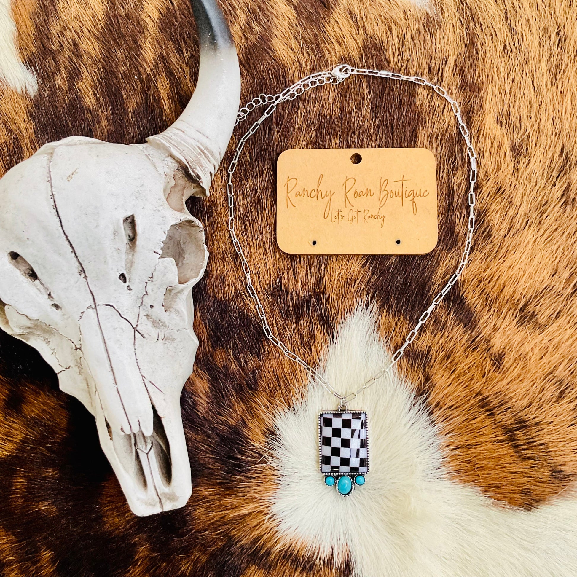 Elevate your boutique’s collection with this Western-inspired rectangular checker turquoise necklace. Featuring a bold black-and-white checker design framed with burnished silver and accented with turquoise stones, this necklace adds a modern flair to classic Western style. Its adjustable chain ensures a perfect fit for every customer.